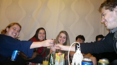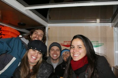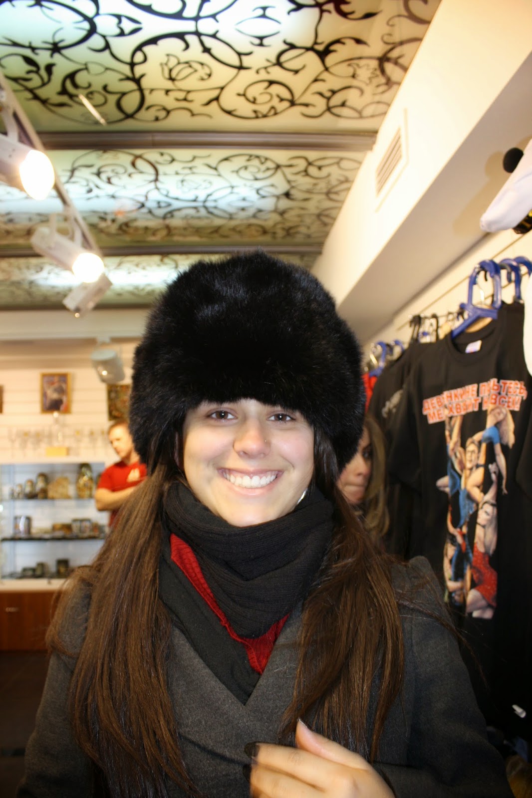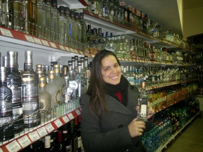 Na volta passamos numa lojinha de souvenir para escolher algumas coisas mas acabamos só tirando foto mesmo. Chegamos no hostel e era a noite da panqueca, eba!! Comemos algumas e fomos numa lojinha comprar bebida para beber no hostel mesmo, estava bem frio para ficar andando na rua. Uns optaram pela pequena latinha de cerveja russa – apenas 1 litro, afinal aqui a cerveja não esquenta de jeito nenhum – e eu e a Cíntia tivemos dificuldade para escolher uma vodka, afinal quase não tinha opção (rs). Eu fiquei com a que leva o nome da cidade mesmo.