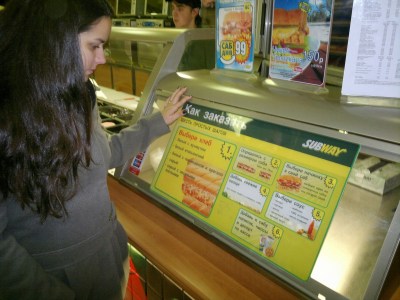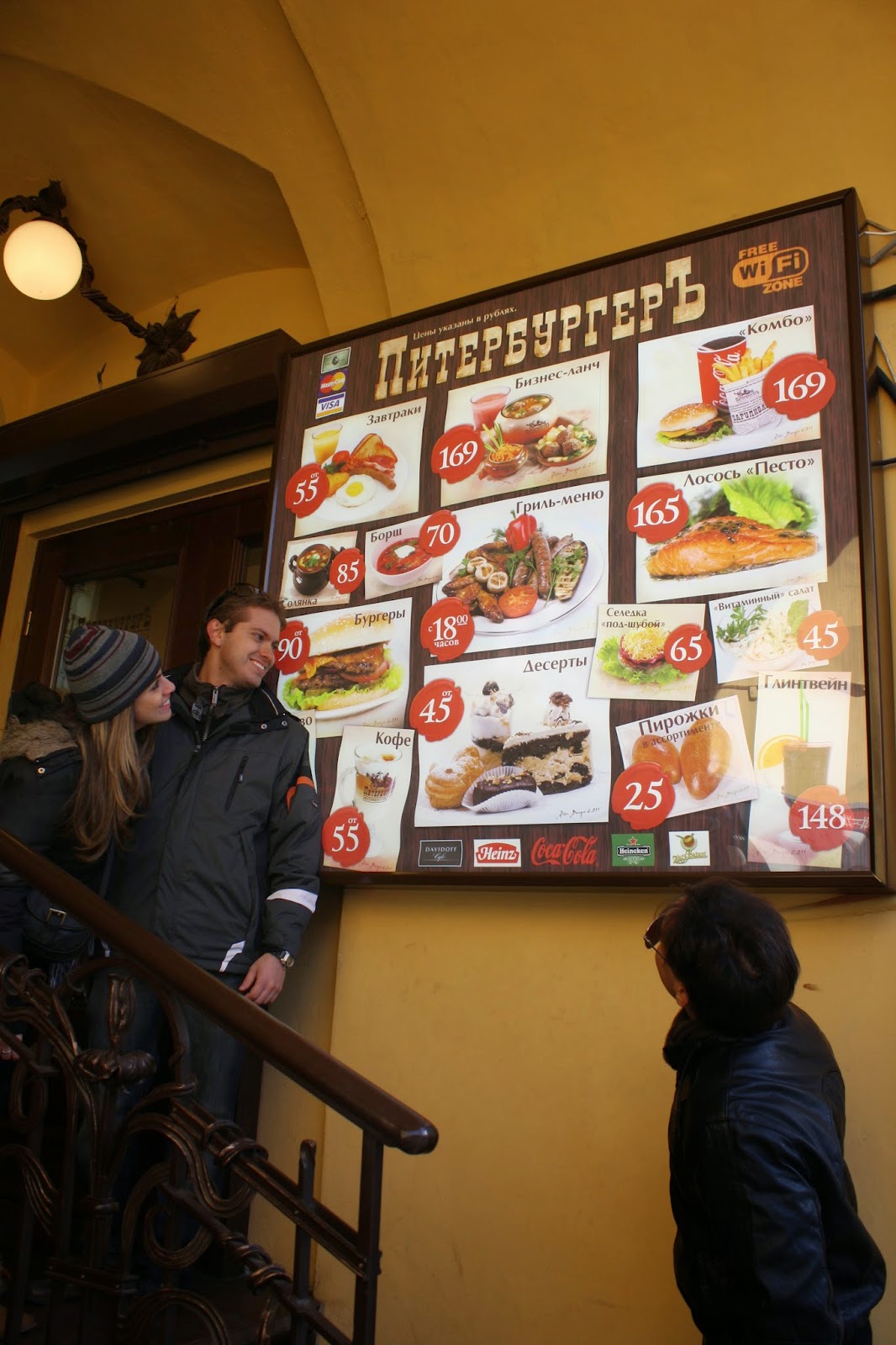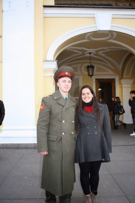 Paramos para comer um Subway antes de voltarmos para o hostel e mesmo assim foi difícil se comunicar, então quando vierem para a Rússia venham preparados. Ouvi dizer que em Moscou é diferente e até algumas placas estão em inglês. Passamos também em frente ao Mc Donald´s, Burger King e outras redes famosas e foi divertido ver como eles escrevem esses nomes. Conseguimos também mais uma foto com os guardinhas, esses bem novinhos com um uniforme diferente.