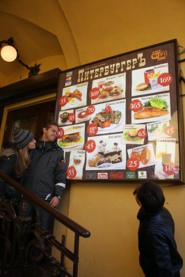 De lá fomos comer, achamos um restaurante russo que pelas fotos as comidas pareciam gostosas e como era buffet podíamos só apontar e pagar. A comida estava bem gostosa e foi baratinho, vale a pena. O nome não consigo escrever, mas é esse aí da foto abaixo e fica bem pertinho da igreja mesmo subindo sentido a rua principal – Nevsky Prospect.