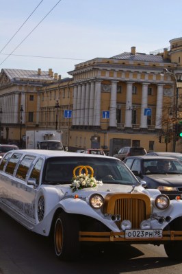 Fomos beirando o Rio Neva até o Old Stock Exchange and Rostral Columns. Incrível como o rio é super largo, aliás tudo lá é em grande escala. No caminho notamos várias pessoas casando e tirando fotos e os veículos todos com uma mesma decoração meio peculiar como podem ver na foto, pelo visto super comum por lá.