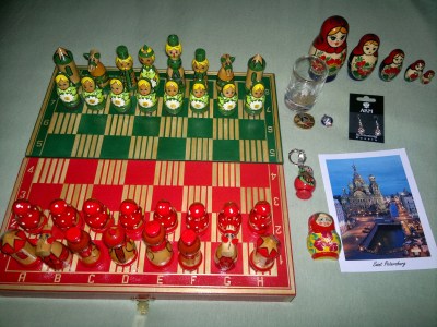 Como tinha sobrado alguns Rubles (moeda russa) resolvemos parar naquela lojinha de souvenir e comprar algumas coisas. Antes de chegarmos lá, meu amigo viu um cara que parecia nos seguir. Na hora de cruzar a rua por baixo ele veio andando super rápido e demos passagem e para nossa surpresa ele parou ao invés de nos passar. Enfim, continuamos até a lojinha. Para minha surpresa, xadrez é um dos jogos mais comuns por aqui e eles são muito bons nisso então decidimos compramos um jogo de xadrez típico, super lindo de Matrioshka – aqueles bonequinhas que entram uma dentro da outra e representam a família! Quando estava saindo da loja só senti alguém caindo na minha perna e quando olho, meu amigo e um cara se pegando no chão!!!!