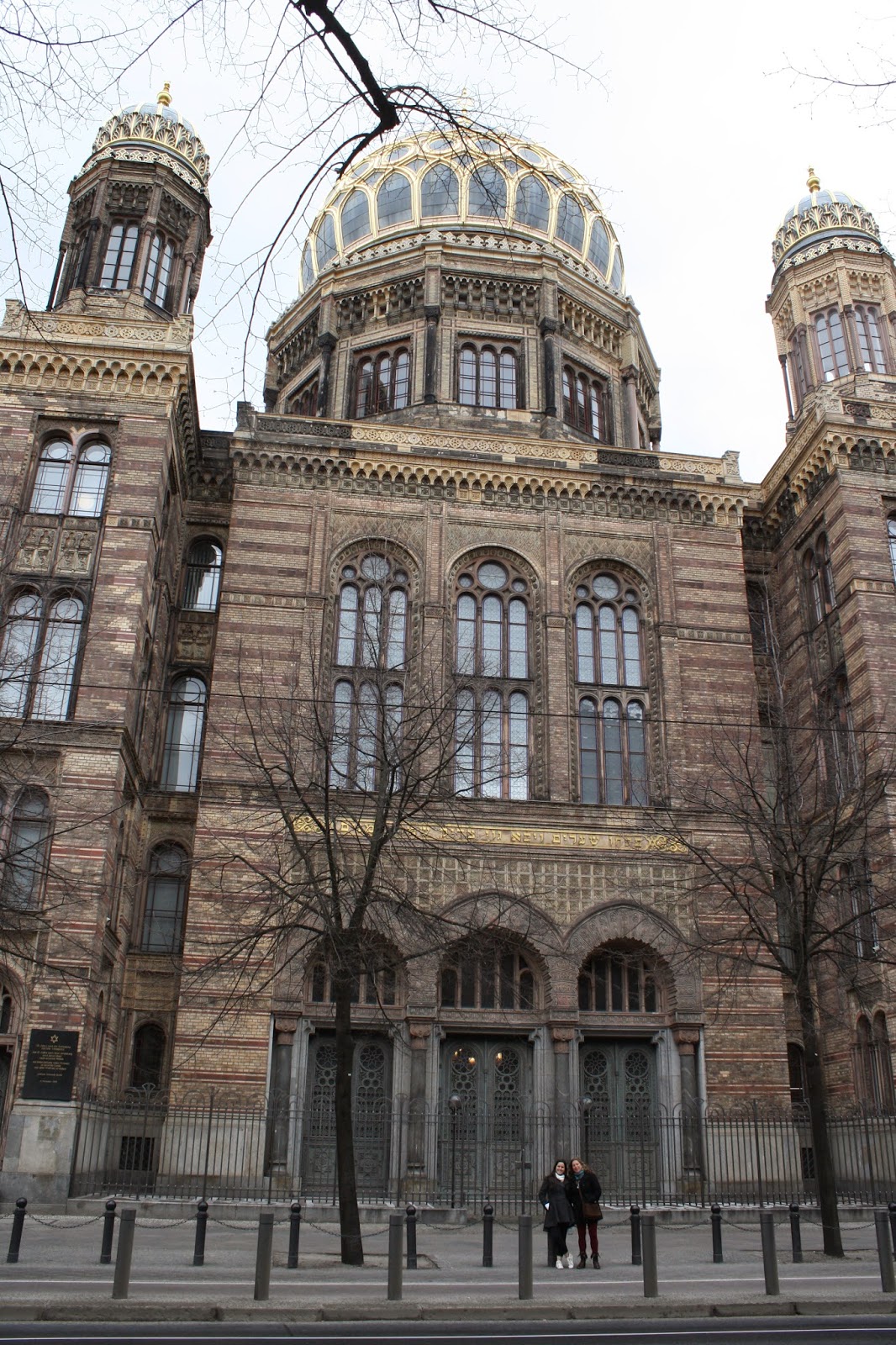 Seguimos sentido Mitte (centro da cidade) e no caminho tinha uma enorme Sinagoga, enorme mesmo, olha o nosso tamanho do lado dela, chamada de Nova Sinagoga – Centro Judaico. De todos os cantos no caminho para a Museuminsel dava para ver a Berliner Fernsehturm, uma antena de TV que conta com restaurante no topo e vista panorâmica da cidade.