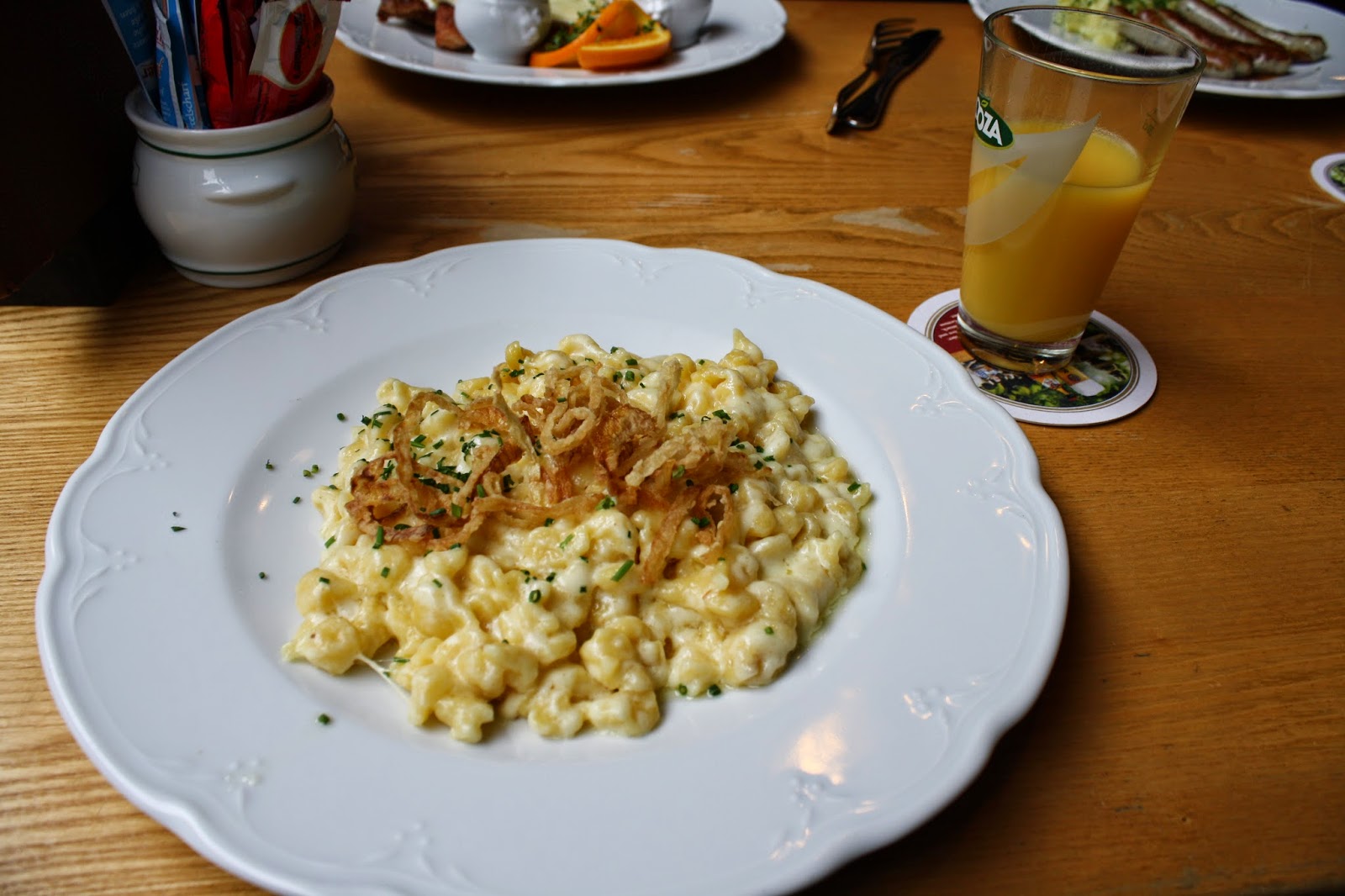 Como saco vazio não para em pé era hora de comer algo, minha irmã recomendou um lugar que eles tinham ido chamado Maximilian´s. Adoro uma boa comida alemã e optei pelo Käsespätzle, um macarrão com queijo e cebola, mas os mais carnívoros comeram o mais típico Eisbein, joelho de porco com purê de batata, acompanhado de cerveja alemã, lógico.