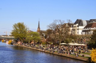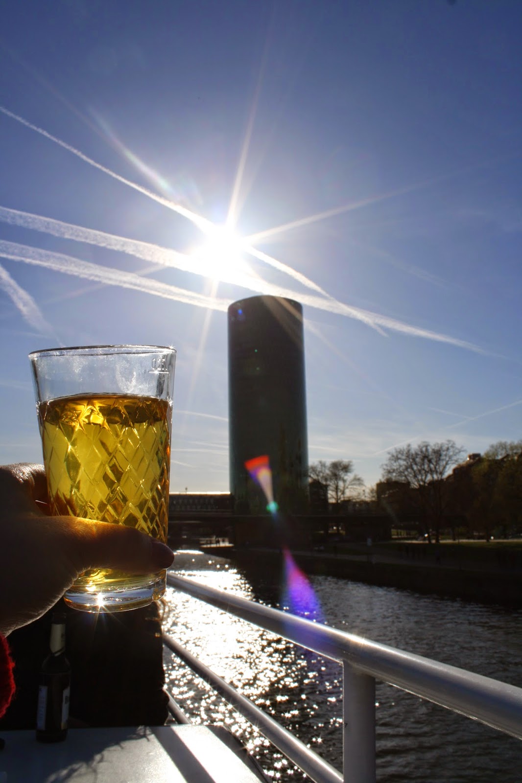 O passeio não tem muita coisa interessante no caminho mas é bem relaxante. Pedimos mais umas Pommes no barco e um Apfelwein (vinho de maça) típico da região. O copo que é servido faz homenagem a Westhafen Tower , um dos prédios da Main-hatan, como eles chamam em referência ao centro comercial Manhattan nos EUA.