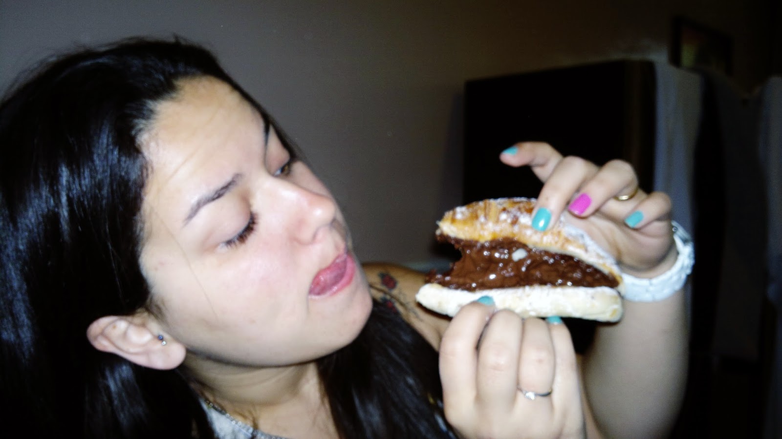 No dia seguinte de manhã, meu pai e a Sô acordaram bem cedinho e foram na feira que ficava na rua do nosso hotel e trouxeram de lá só comida boa. O nosso café da manhã foi croissant frescos com recheio de Nutella e para lanche da tarde já estava garantido mozzarella de búfalo e tomate.