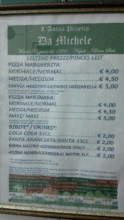 Chegando lá estávamos morrendo de fome e fomos direto conhecer a mais famosa e tradicional pizzaria da cidade, afinal tudo começou por Nápolis: Pizzeria da Michele. Uma pizzaria bem pequena e aconchegante com apenas dois sabores de pizza mas com uma fila de espera de no mínimo meia hora.