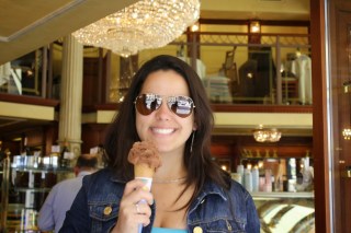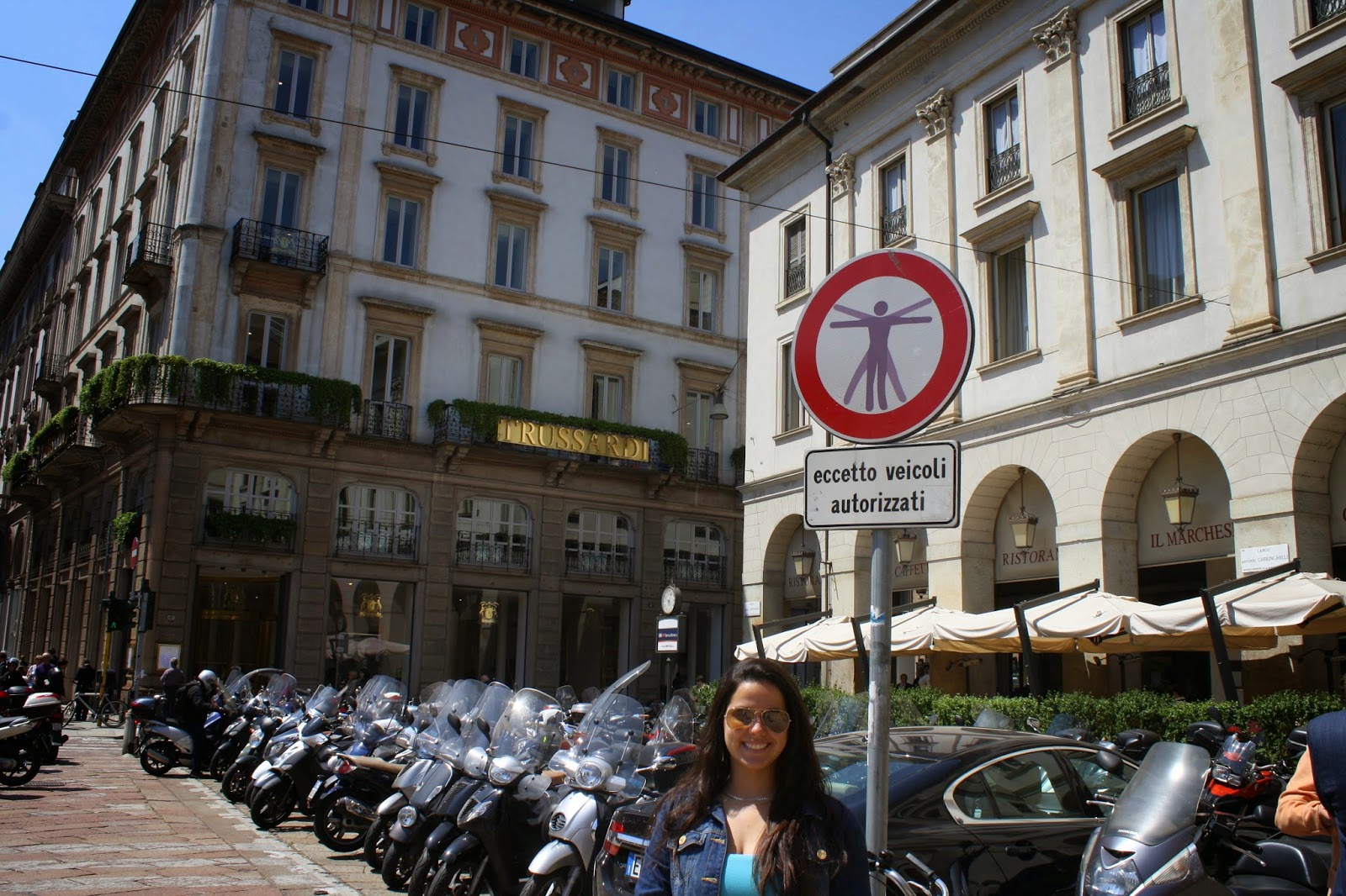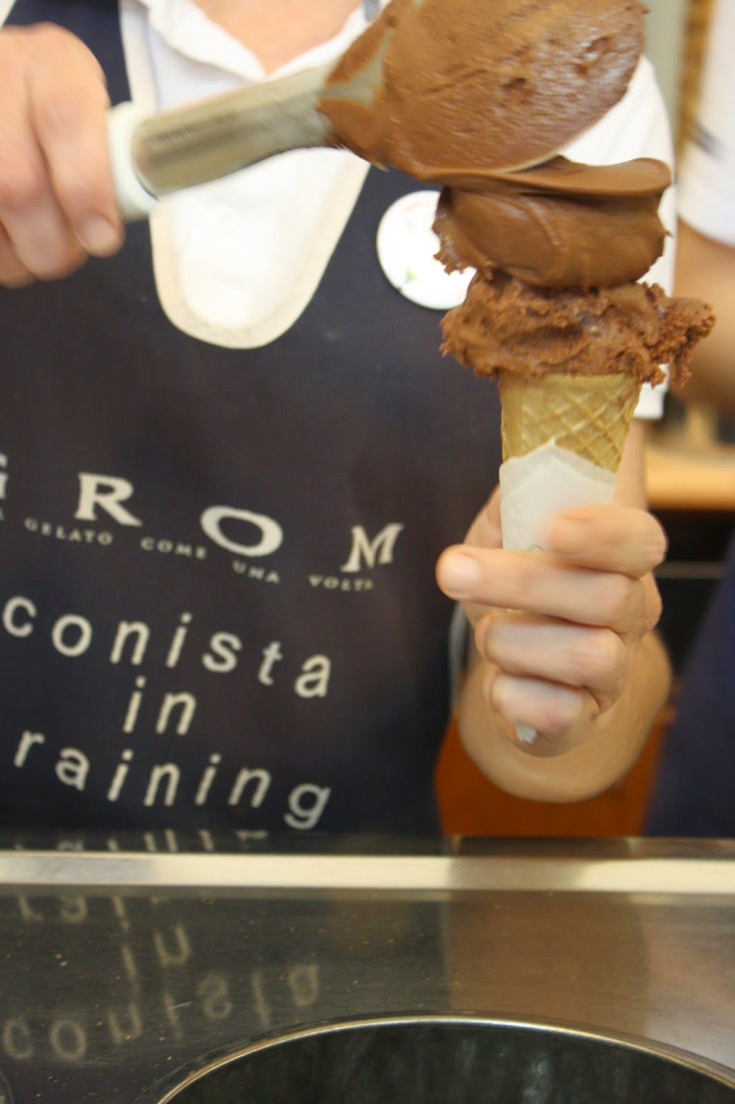 Passamos em frente ao Teatro alla Scala e adorei o detalhe das placas por ali, uma referência ao grande Leonardo da Vinci. E como na Itália o melhor a fazer é comer e tomar gelato, paramos para nos refrescar na famosa e tradicional gelateria Grom. Acho que olharam tanto pro meu sorvete que derrubei ele logo ali na saída e desisti de pegar a fila de novo – acabei comprando outro gelato a alguns metros dali.