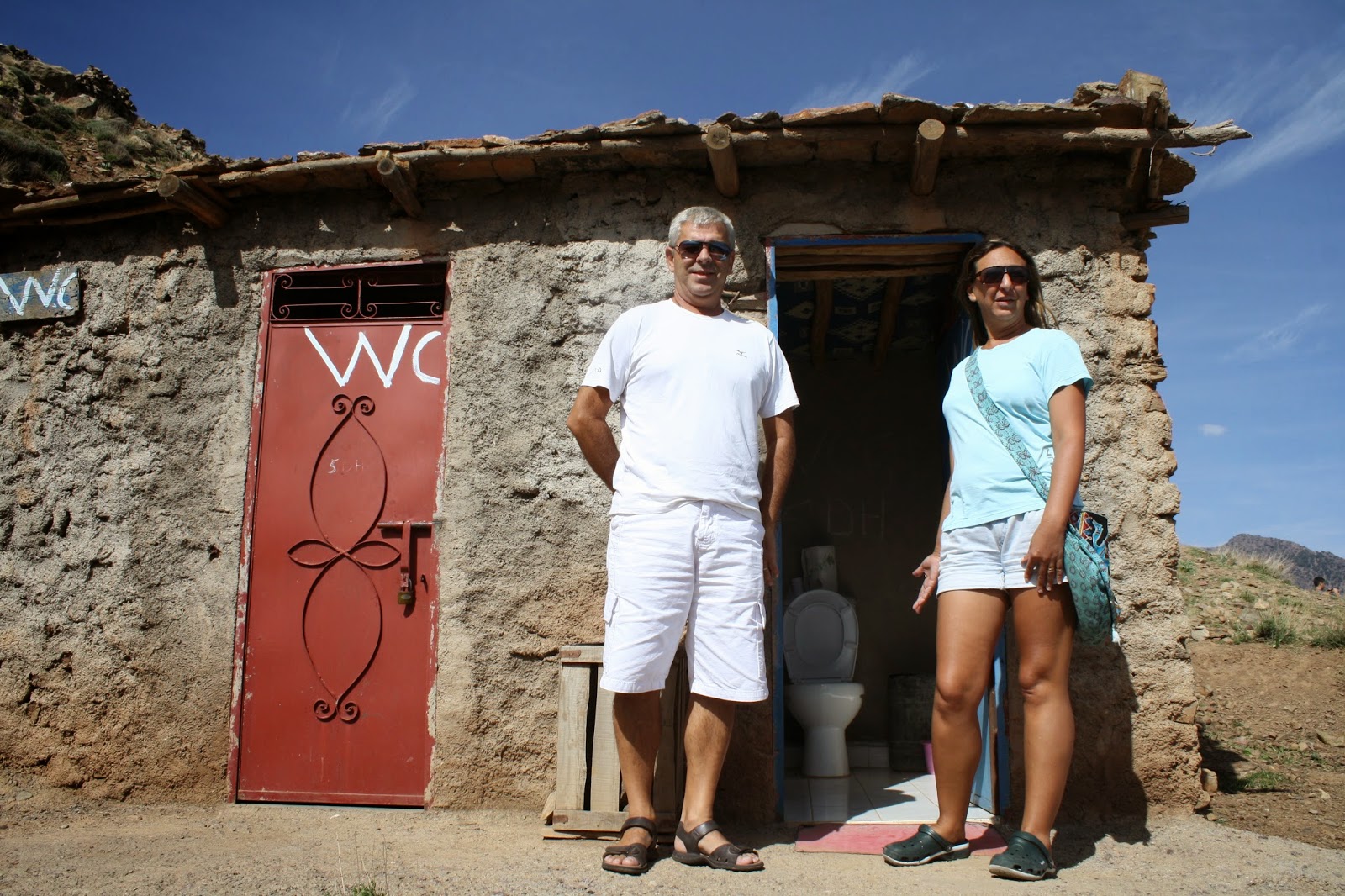 A viagem pelos Atlas é maravilhosa, uma montanha mais incrível que a outra, diversas formas, parece que foram escavadas e desenhadas a mão, diversos tons de marrom. Depois de 2 horas de viagem a primeira parada, banheiro e água. A cada parada comprávamos 2 litros de água cada um e tomávamos tudo – sem exagero nenhum! A lá lá oooo, mas que calorrrrr…!