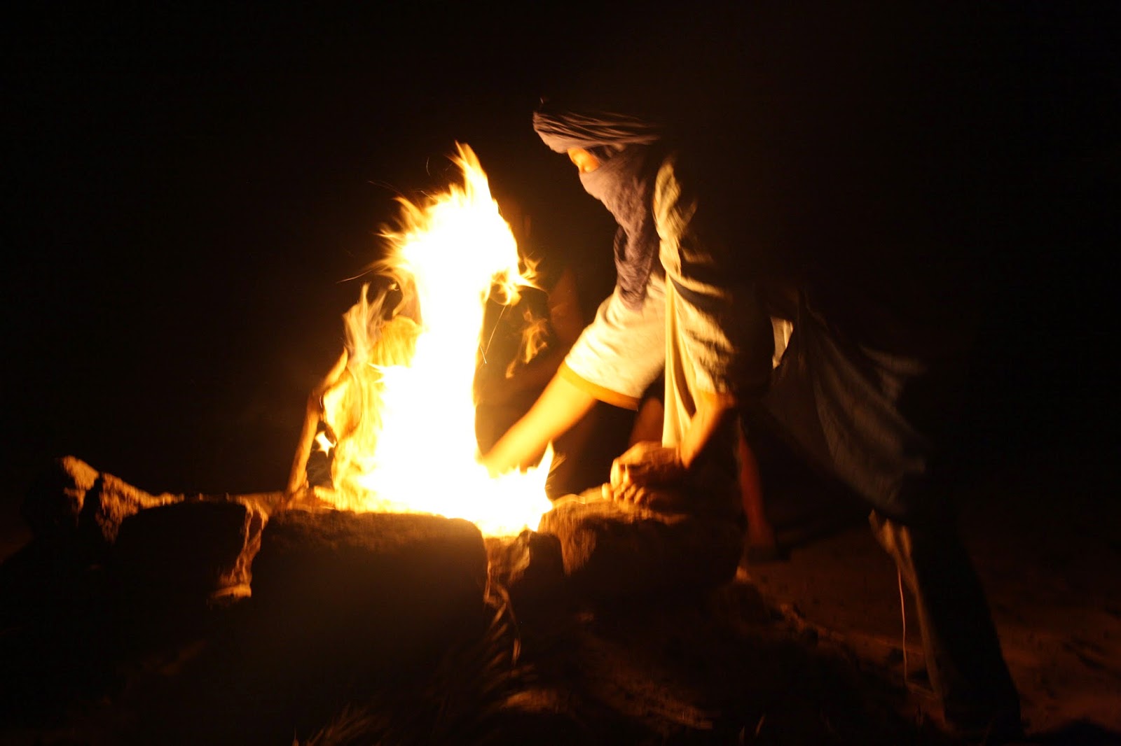 Depois do jantar, os bérberes fizeram uma fogueira e tocaram músicas locais enquanto nós conversávamos e dançávamos ao redor do fogo. Uma vibe muito boa. Algo muito único e especial. Meu pai e minha madrasta foram dormir e algumas outras pessoas também. Conhecemos um grupo de argentinos e ficamos deitados na areia admirando a beleza do céu e a infinidade de estrelas. Nenhuma luz, nenhum prédio, somente nós no meio daquela imensidão. Apaixonante! Um momento que a foto não pode registrar mas vai ficar pra sempre guardado na memória.