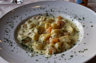Voltei para hotel, tomei banho e descemos para jantar. Pedi um gnocchi com camarão ao molho branco que estava demais, confesso que foi meu jantar todos os dias que estive lá.