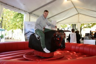 Até touro mecânico, parede de escalada e exposição de carros tinha por lá e o sol estava firme e forte também. Ganhamos bolsa de compras, canetas, notepads e até os famosos Gummy bears, foi muito divertido, escolhemos o dia certo.