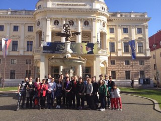 | Grupo do Walking Tour em frente ao Teatro Nacional da Eslováquia