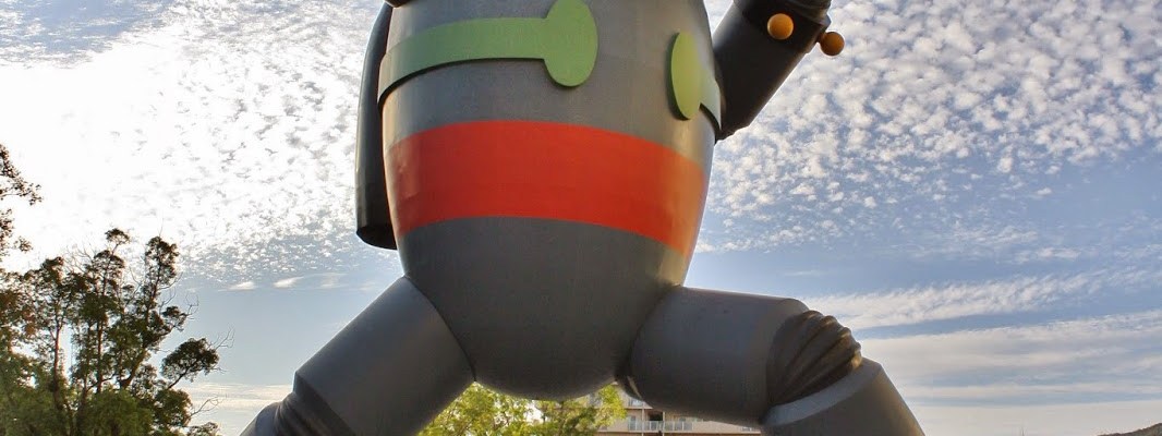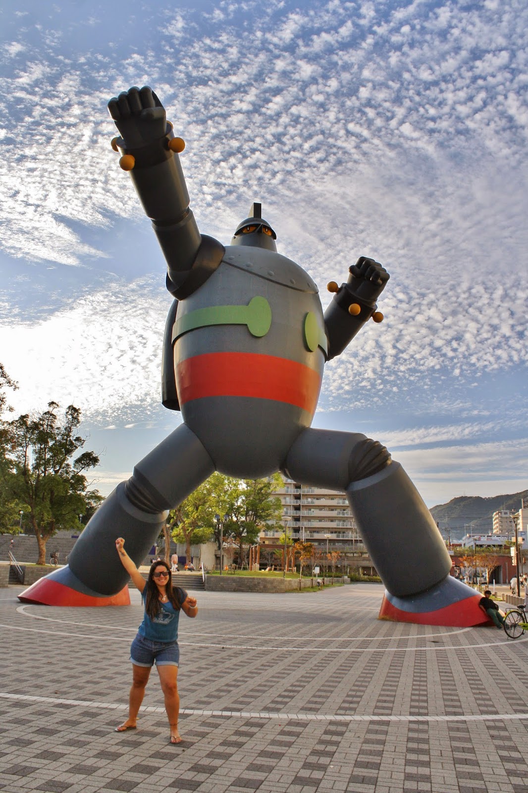 Chegamos em Kobe em uma hora e passamos apenas uma tarde. Acabamos ficando até o anoitecer pois nos disseram que a cidade é muito mais bonita a noite. A primeira parada foi o porto da cidade mas como ainda estava claro decidimos ir conhecer o Tetsujin primeiro, uma estátua de um robô mangá de 18 metros de altura. E lá estava ele, no meio da praça, gigante.