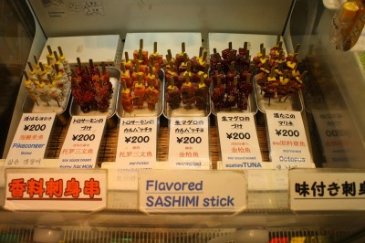 Beliscamos algumas coisas no caminho, adorei a idéia do sashimi de salmão em palitinho, super prático. E foi lá também que mandamos fazer nossos hashis personalizados, me senti tipo o Harry Potter na loja de varinhas hehe. Como ainda não tinhamos matado a fome fomos atrás de um restaurante que só nos tomou tempo, já que quando chegamos no local indicado não tinha restaurante nenhum. E lá fomos nós almoçar no konbini. Pra ser sincera, nem reclamo pois a comida é boa e bem barata. Você come bem gastando cerca de R$6-10. Fica a dica para quem está viajando com pouca grana como nós.