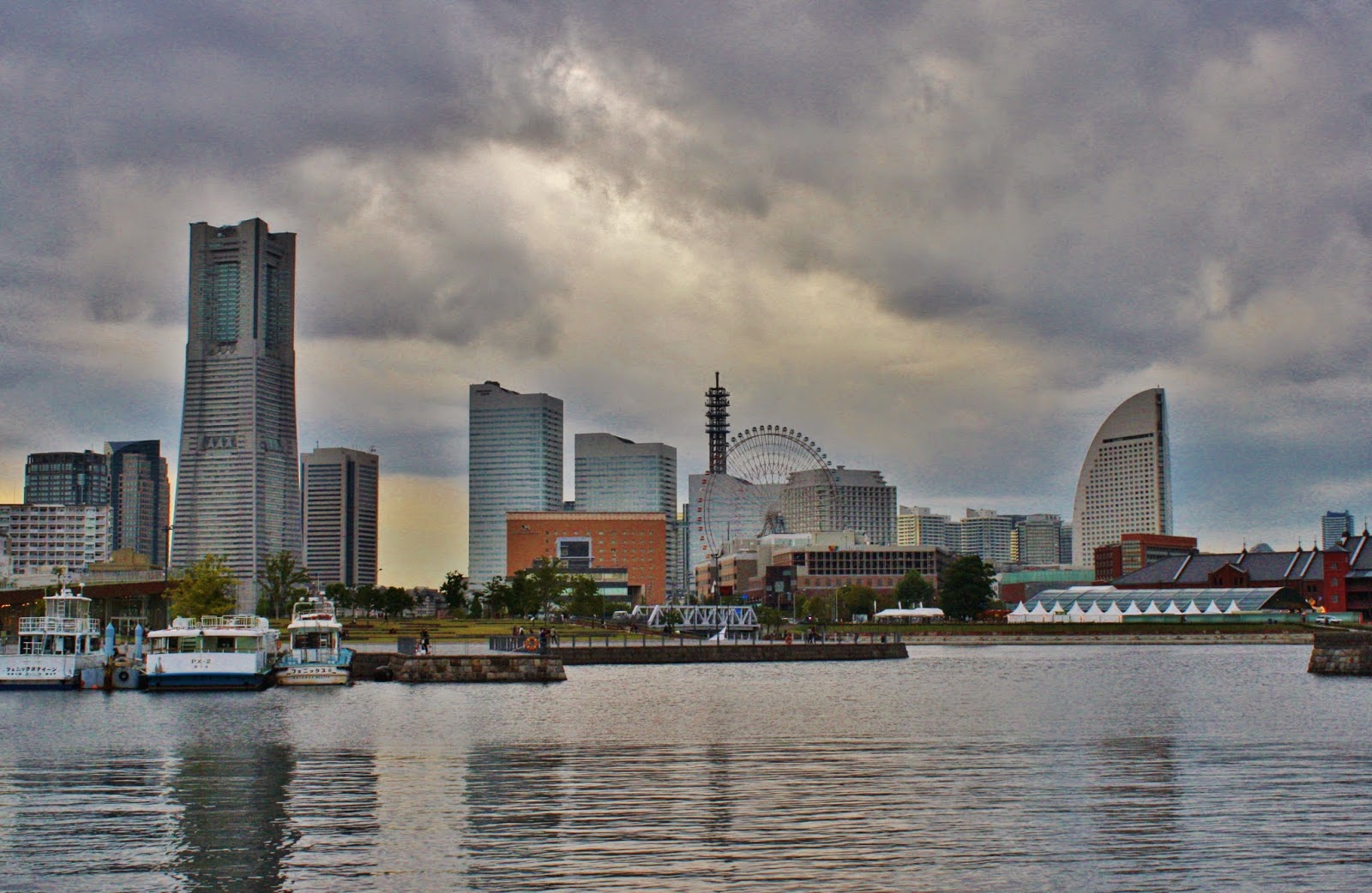 De lá seguimos para Yokohama, mais 1h30 de estrada e lá estávamos. Deixamos o carro no estacionamento e fomos caminhar pela região do pier de Osanbashi. Achei lindo o caminho, gostei de ver os prédios refletindo na água.