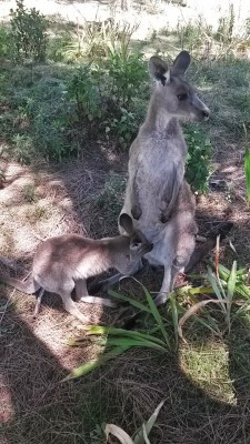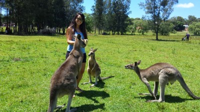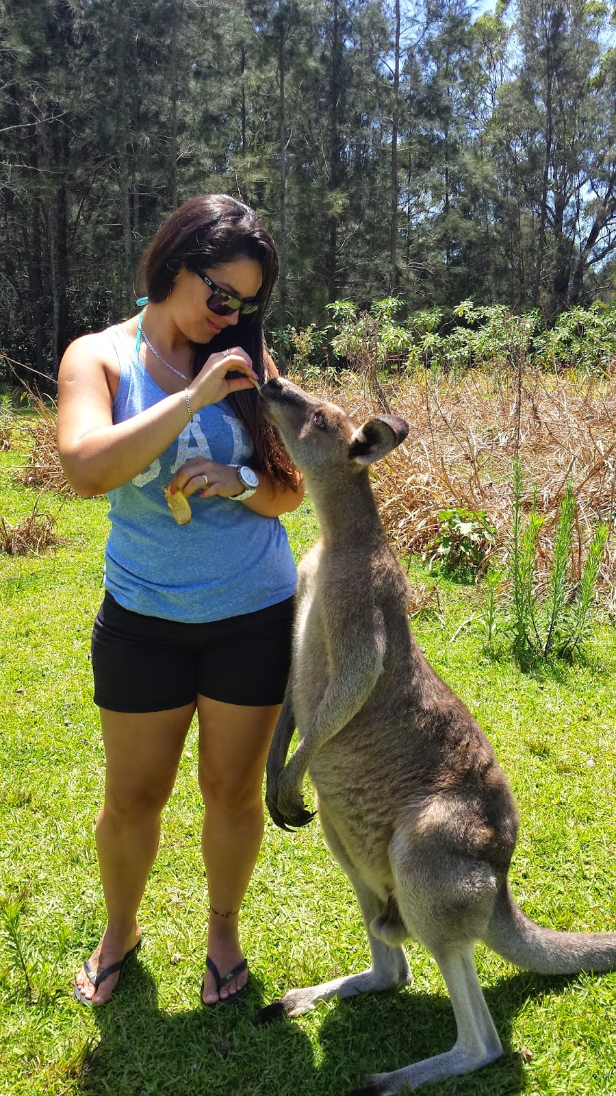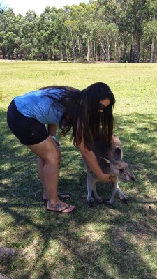 Eu parecia criança com aquele monte de canguru em volta de mim, uma alegria sem fim poder finalmente ver esses bichos pessoalmente! Eles já estão acostumados com pessoas então vem comer na sua mão, na maior tranquilidade. No começo fiquei meio com medo, eles são da minha altura e vem pulando pegar a comida mas são super dóceis.