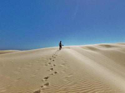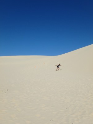Chegando em Birubi Beach tem umas 3-4 companias que fazem sandboard além de passeio a camelo e aluguel de jipe e tivemos apenas que cotar em todas para conseguir uma diferença de $10 entre uma e outra. Pagamos $15 por pessoa para fazer sandboard. Eles te levam até as dunas, tem um instrutor que te explica como funciona e depois você pode ficar quanto tempo quiser lá que quando cansar eles te trazem de volta a praia. Fechado!
