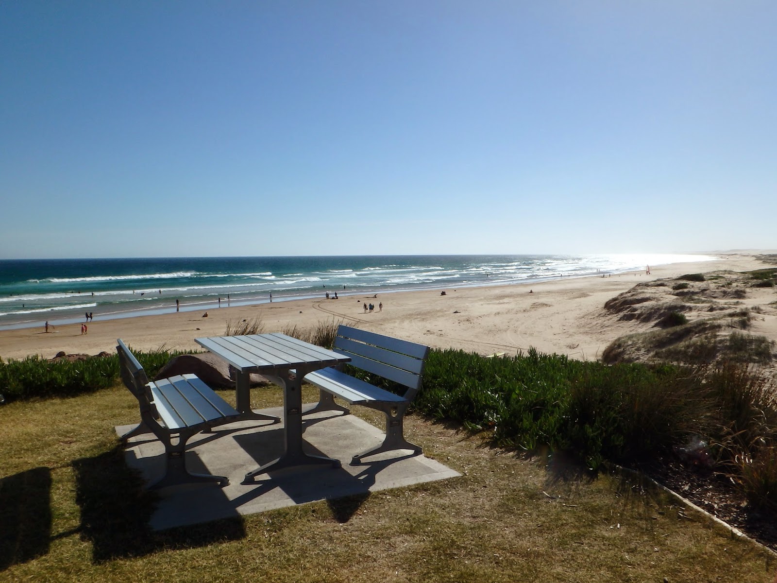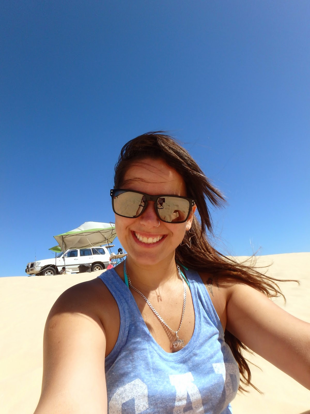 Chegamos lá e ficamos meio na dúvida da onde ir primeiro então fomos direto para Nelson Bay no balcão de informação para decidir o que fazer. Nelson Bay é o centrinho de Port Stephens, aonde ficam os restaurantes e lojinhas mas nada muito além disso. Como tinha ouvido falar que tinha lugar para fazer sandboard, decidi ir lá. As dunas ficam em Anna Bay mais exatamente na Birubi Beach, uma “pequena” praia de 35km de extensão.