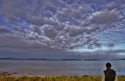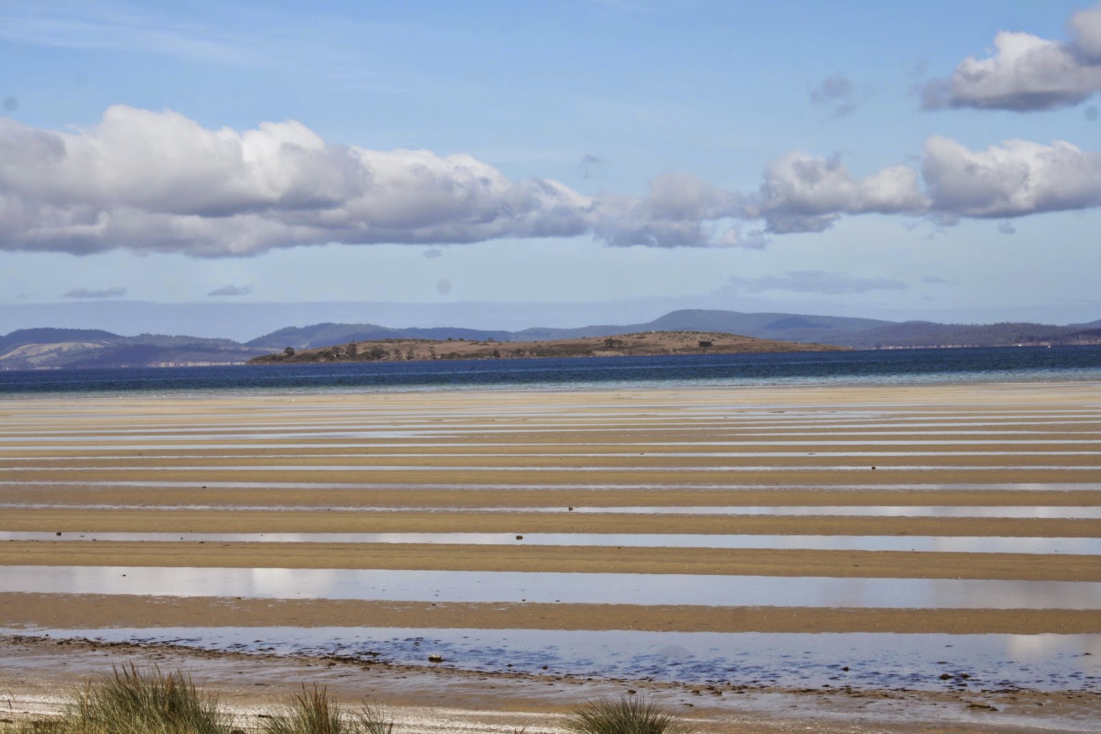Na ida tínhamos parado em Dunalley Bay mas estava meio nublado então não foi muito interessante, a não ser pelo incrível desenho que as nuvens faziam. Na volta o sol já tinha saído, o mar recuado e foi um espetáculo de se ver. A foto consegue descrever um pouco da mistura de mar azul e areia.