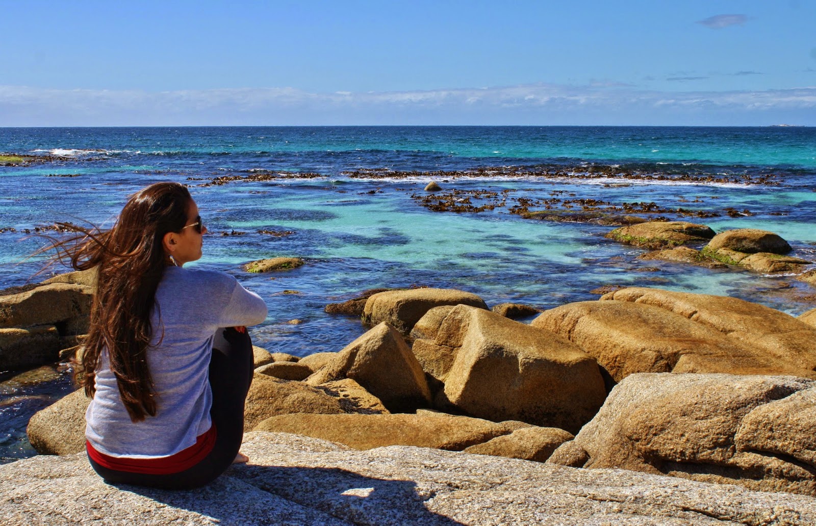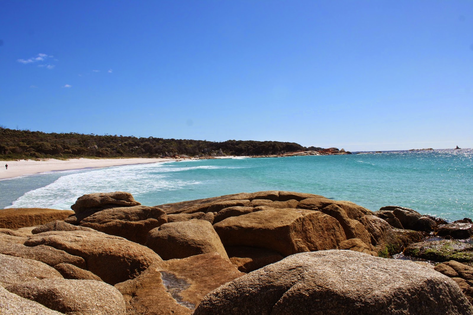De lá seguimos até Bay of Fires. Na estrada tem várias entradas para várias praias que ficam na Bay of Fires, escolhemos uma e entramos. Foi o mar mais lindo e mais azul e cristalino que vi em toda minha vida. Uma areia branca, ninguém na praia, era a imagem do paraíso. Fiquei apaixonada por aquele cenário. Estava um vento bem gelado mas mesmo assim ficamos por pelo menos 1 hora ali boquiabertos com a beleza natural da Tasmânia.