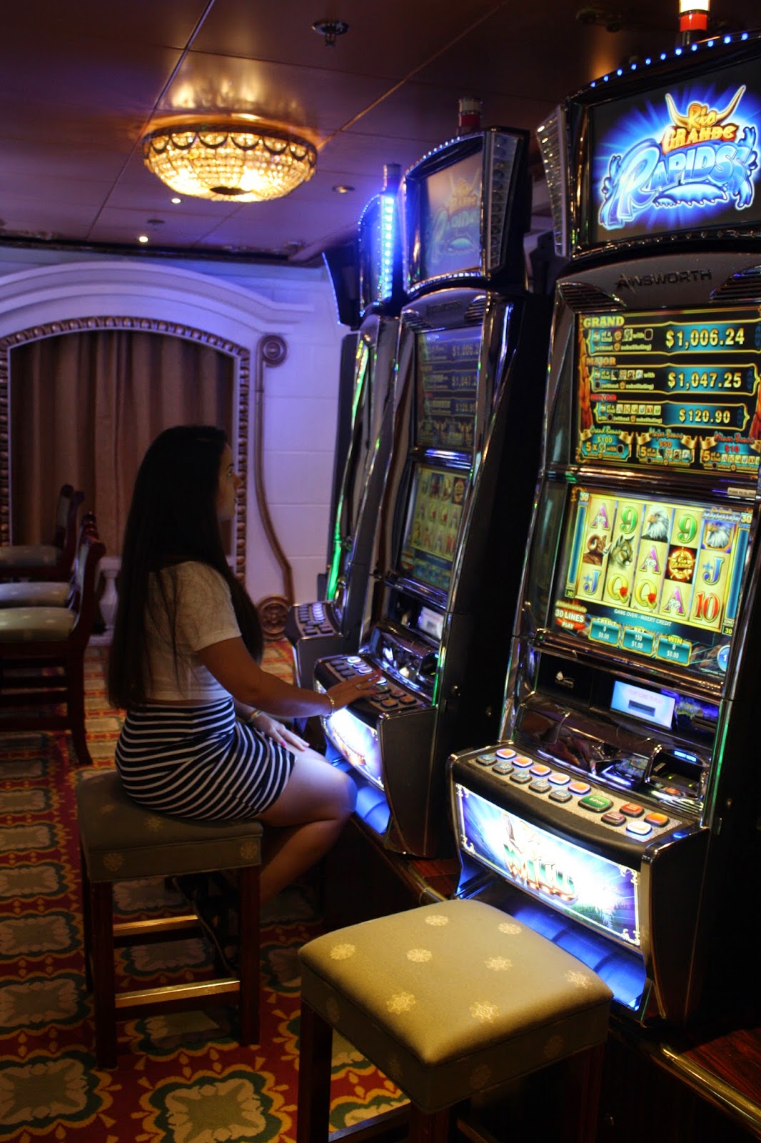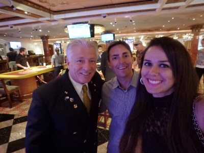 Bom, não preciso dizer que dentro do navio tem tudo que se possa imaginar: academia, piscina com água do mar, ofurô, salão de beleza, massagem, tratamento estético, teatro, música, balada, toboágua, mini golf, quadra de basquete e futebol, ping pong, biblioteca, cassino, galeria de arte, lojas, igreja… Eu particularmente amei a parte de entretenimento. Assistimos aos comediantes Paul Brasch e Michael Bennett, simplesmente os melhores, ri demais! Os musicais também eram ótimos e os dançarinos e cantores muito bons também. Um dos dias enquanto passávamos pelo cassino demos de cara com o Capitão italiano do navio – Adriano Binacchi.