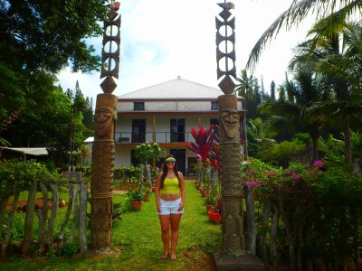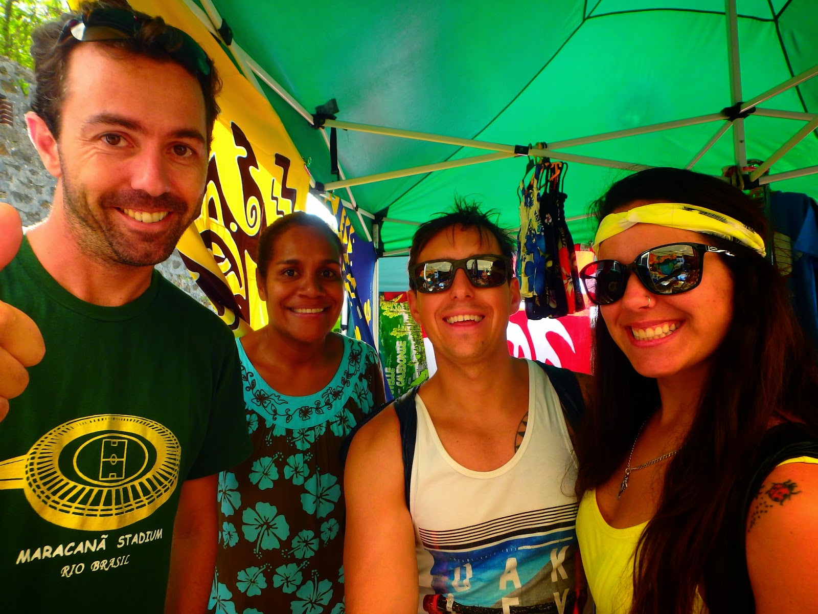 Já era hora de voltar mas não sem antes comprar alguma lembrancinha do lugar. Achei um imã do estilo dos totens que vimos e foi esse mesmo que compramos. Quando fui pagar vejo que o rapaz está com uma blusa do Maracanã, isso, Rio de Janeiro, Brasil! Lógico que tive que elogiar a camiseta e o Nicolas – um frânces que agora dá aulas em Nova Caledônia – me disse que esteve ano passado no Rio na casa da prima dele para a Copa. Eeee mundo pequeno, ou seria Brasil grande? Fizemos questão que a Glória – natural da Nova Caledônia – e também trabalha na barraquinha saísse na foto conosco. Para quem não sabe, por lá o idioma falado é um dialeto frânces, então um Bonjour e Merci cai sempre bem para mostrar respeito.