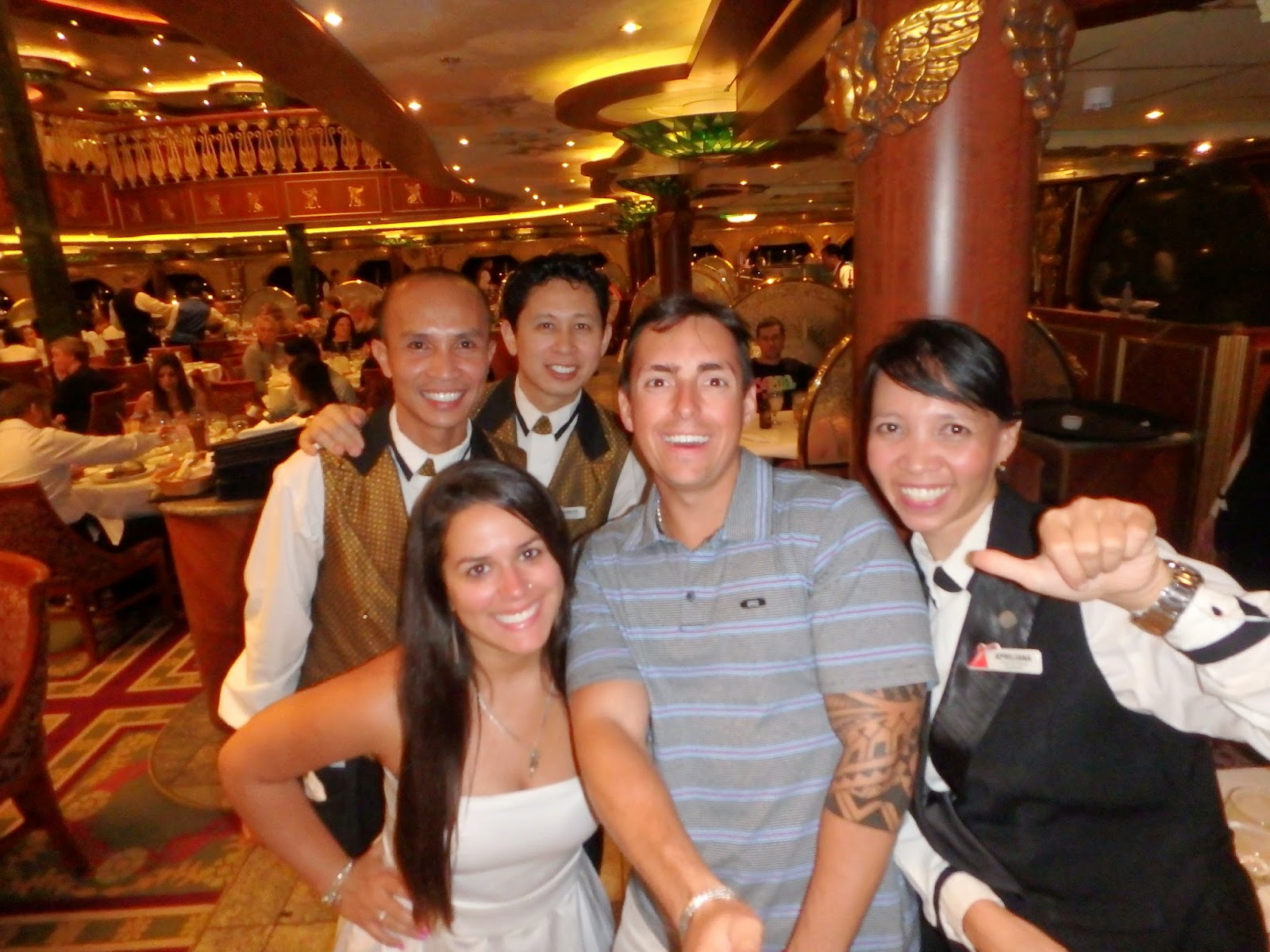 O dia a dia no navio se resume a comer, beber, se divertir e descansar. O café da manhã é super farto com muita panqueca, waffles, frutas, muffins e muita variedade, assim como o almoço. O buffet é enorme e tem sempre um menu diferente além de sobremesas deliciosas, engordei vários kilos. E que tal pizza, hamburger e sorvete 24 horas? Isso mesmo! Conhecemos uma Chef, a Lourdes, peruana super simpática também. A noite era a melhor parte pois íamos no Empire Restaurant, super chique. O cardápio era divino e também mudava todos os dias e tinhamos que ir arrumados. Tinham também noites temáticas – caribenha e mexicana, aonde todo mundo ia “fantasiado” como podia. Ah, esqueci de contar que toda noite os garçons dançavam com a gente, ou cantavam algum música, sempre algo para entreter o jantar, muito divertido!