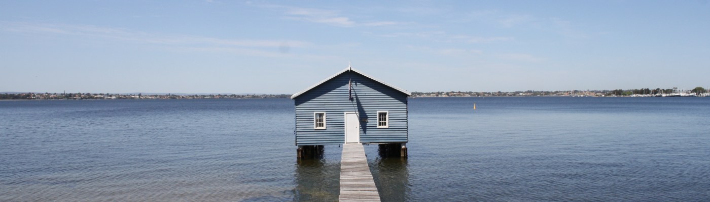 Quando finalmente achamos o “fim” do parque, saímos na avenida em frente a Crawley Edge Boatshed ou Blue Boat House como é conhecida. É um charme essa casinha azul dentro do rio. O caminho até ela agora está interditado, acho que algumas pessoas devem ter se machucado ou caído no rio.