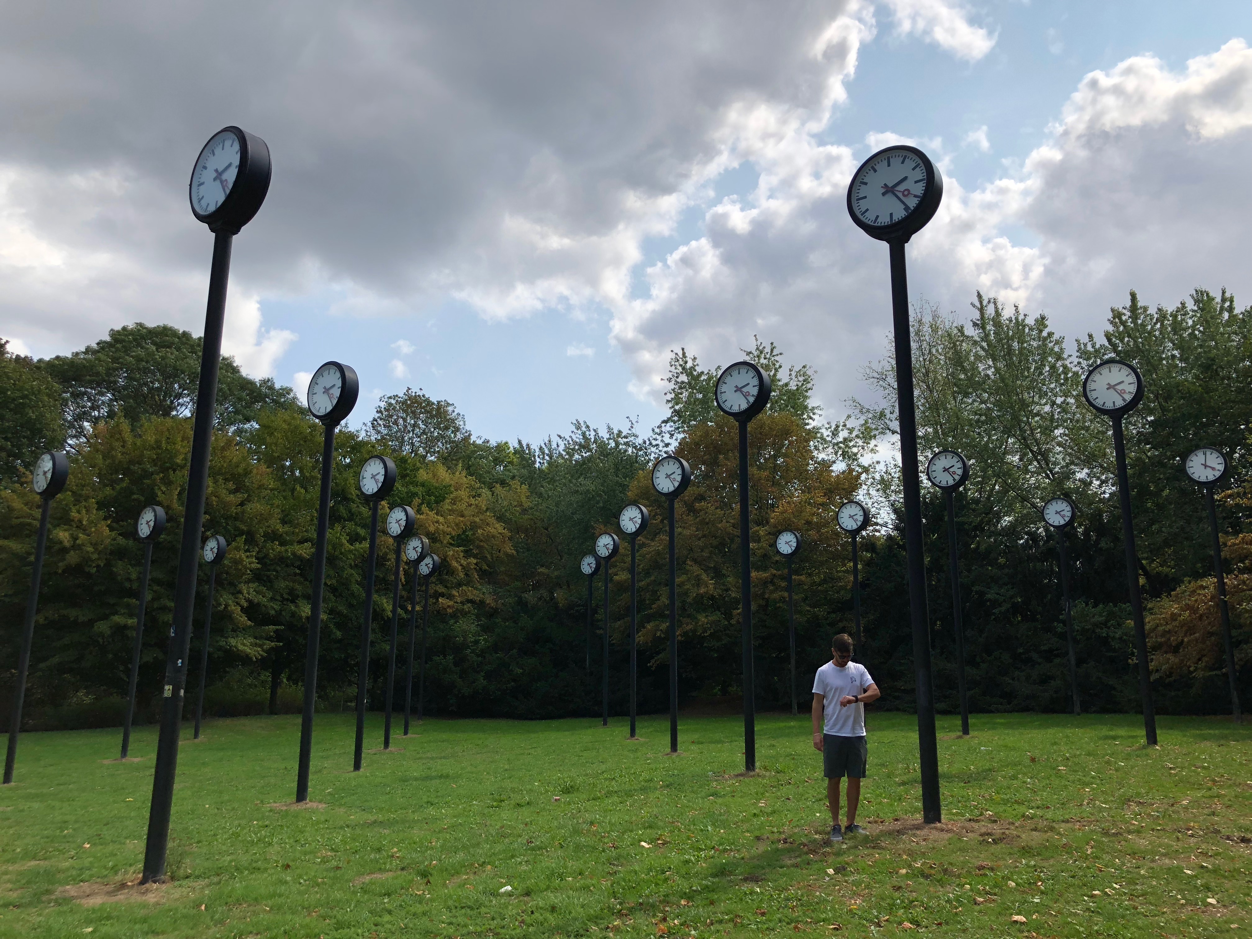 Na volta paramos no Zeitfeld, uma intervenção artística cheia de relógios num parque. Pegamos outro tram de volta até a estação central. Aproveitamos para dar uma voltinha na Primark, comemos na Brauerei Schumacher (€38 casal), passamos no mercado e casa.