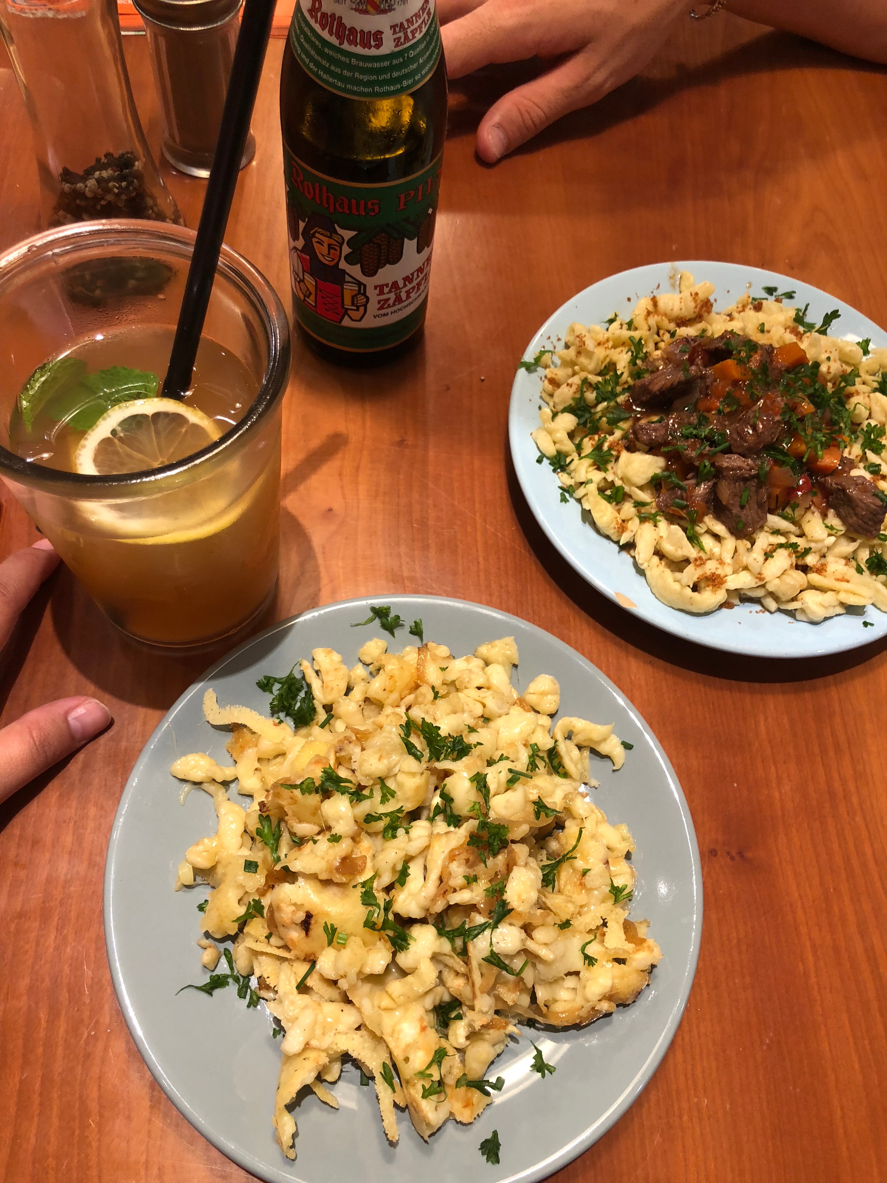 Paramos para tomar uma bem gelada porque estava muito calor e seguimos para comer no Spätzle – Spatz Up (€19 casal), bom demais. É um restaurante bem pequeninho mas que serve um spätzle (tipo um macarrãozinho) super caseiro, eu amei.