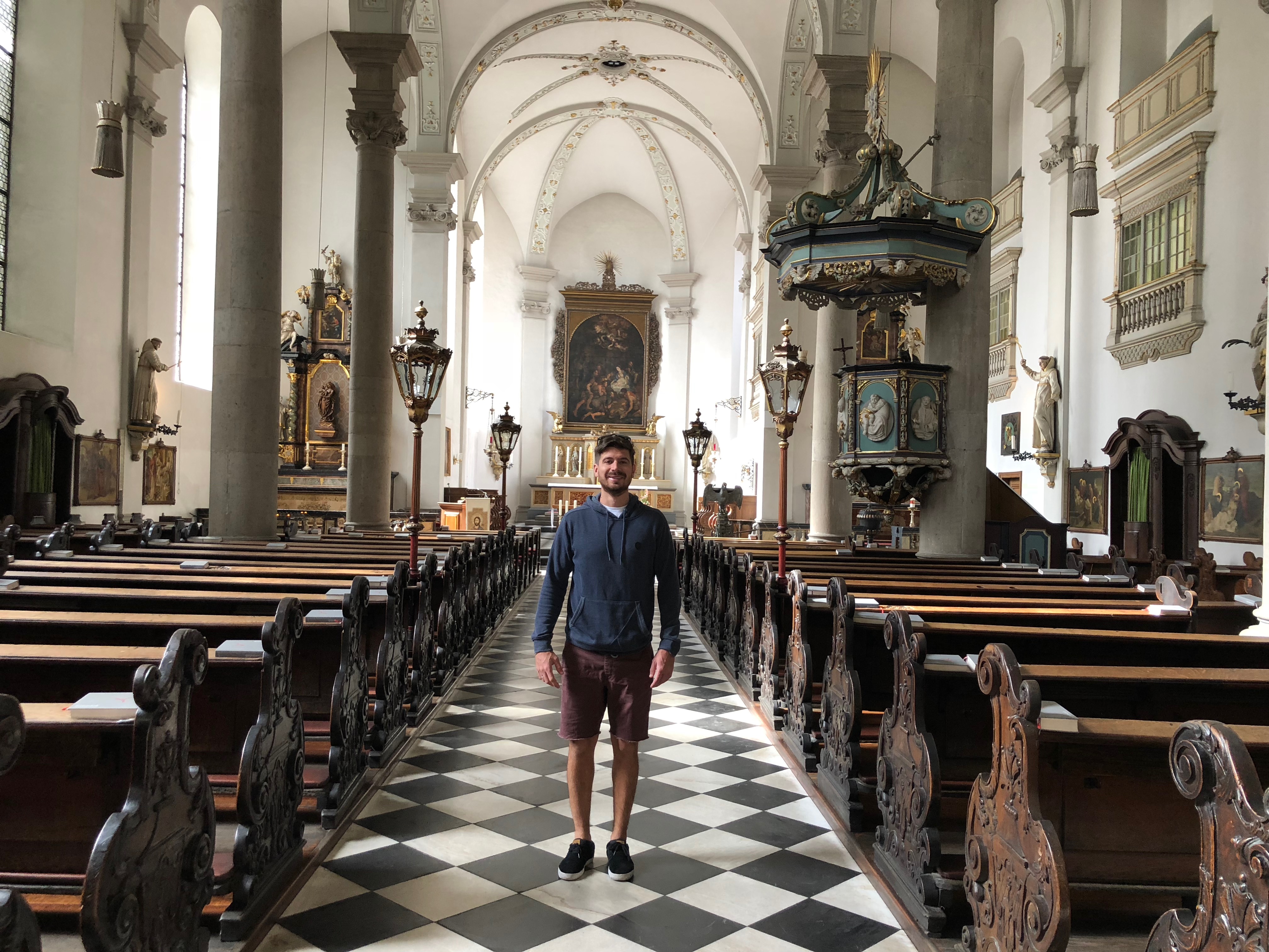 De manhã fomos explorar melhor o Altstadt, centrinho histórico. Começamos passando pela igreja católica Maximilian e achei bem bonita – adorei o chão também.