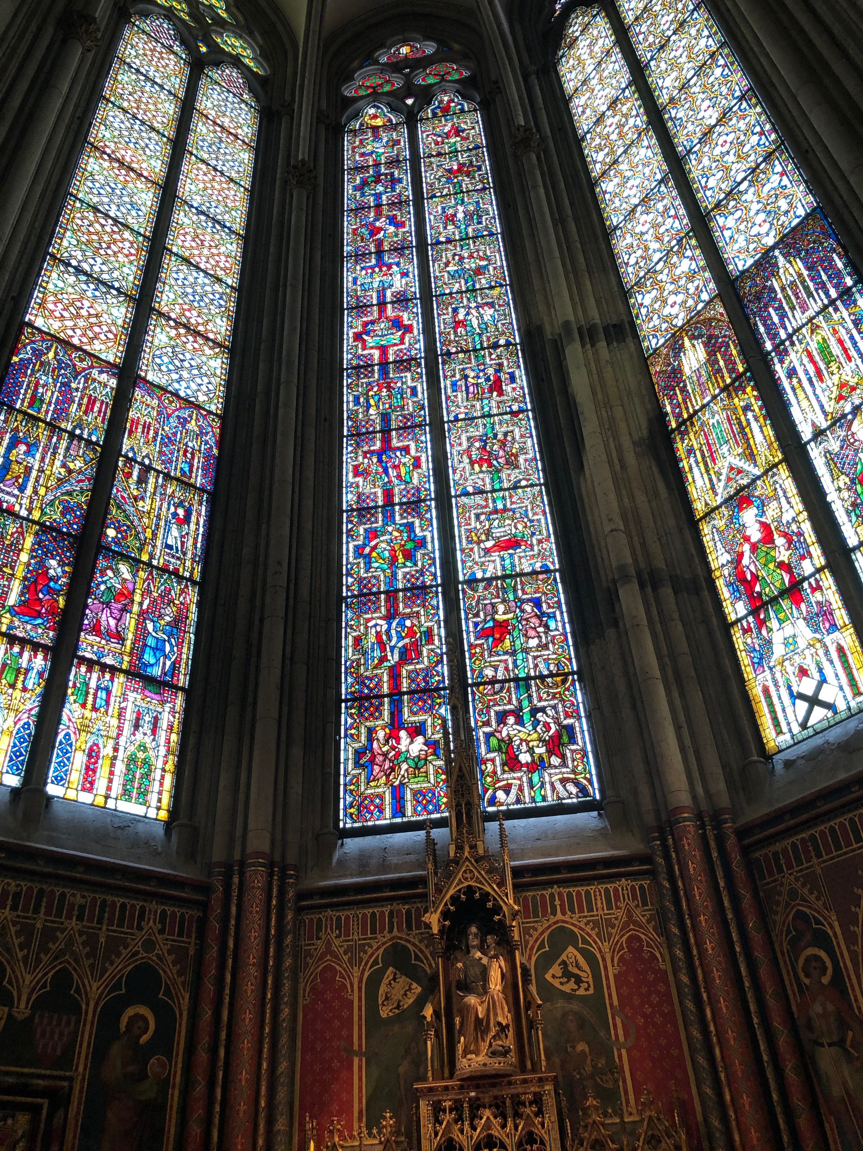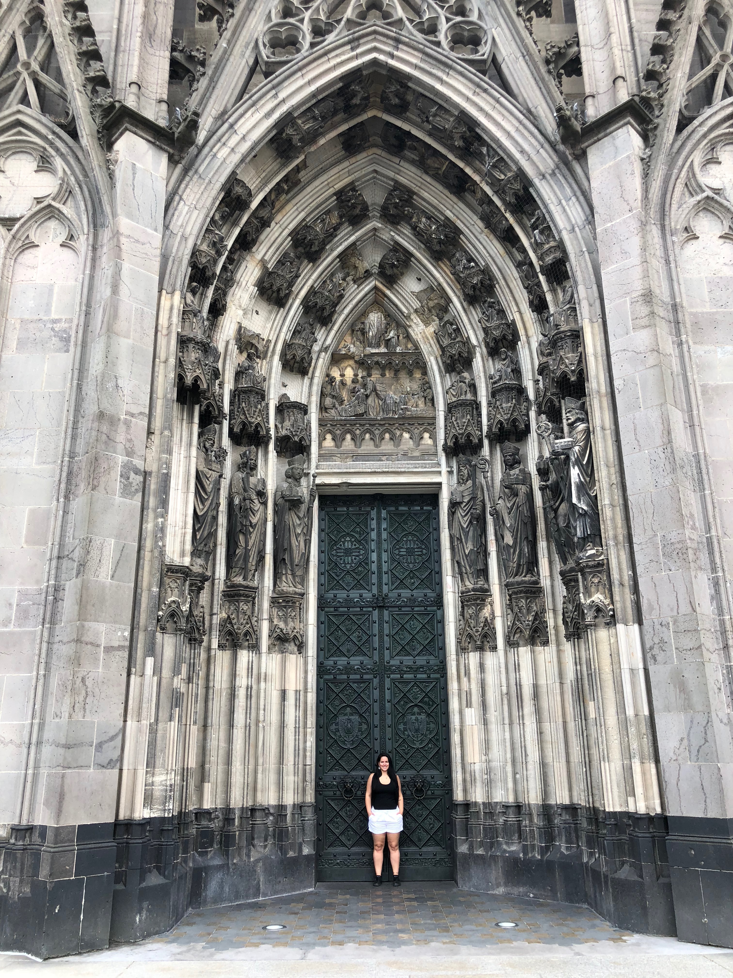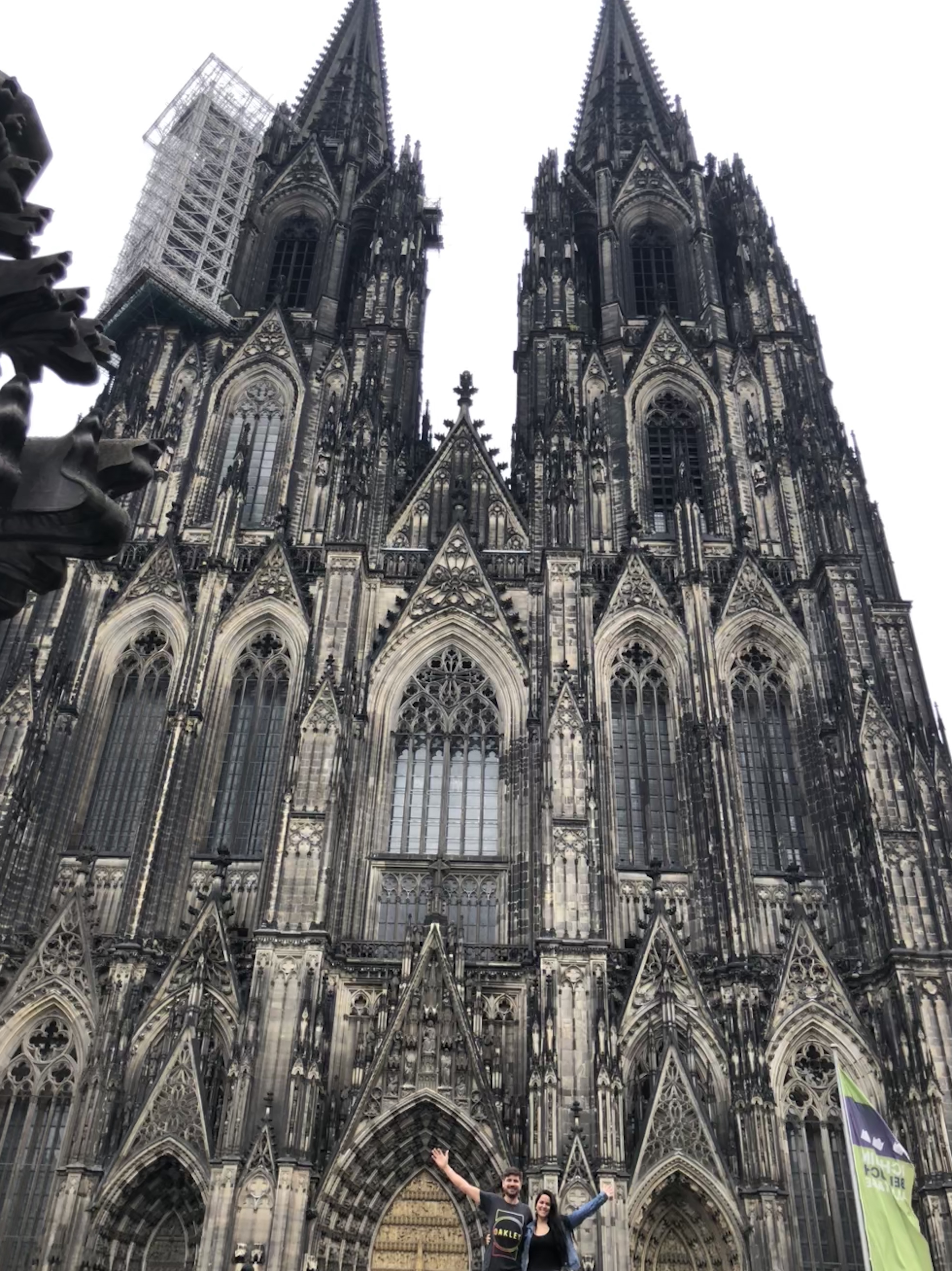 Ainda dentro da estação toda de vidro fiquei sem palavras com o que vi: a Catedral de Colônia. Jura, foi surreal. Levei até a mão na boca de espanto com a beleza daquela catedral, fiquei sem palavras. Ela é enorme, gigantesca mesmo e super impactante. Só de tê-la visto já valeu a ida a Colônia.