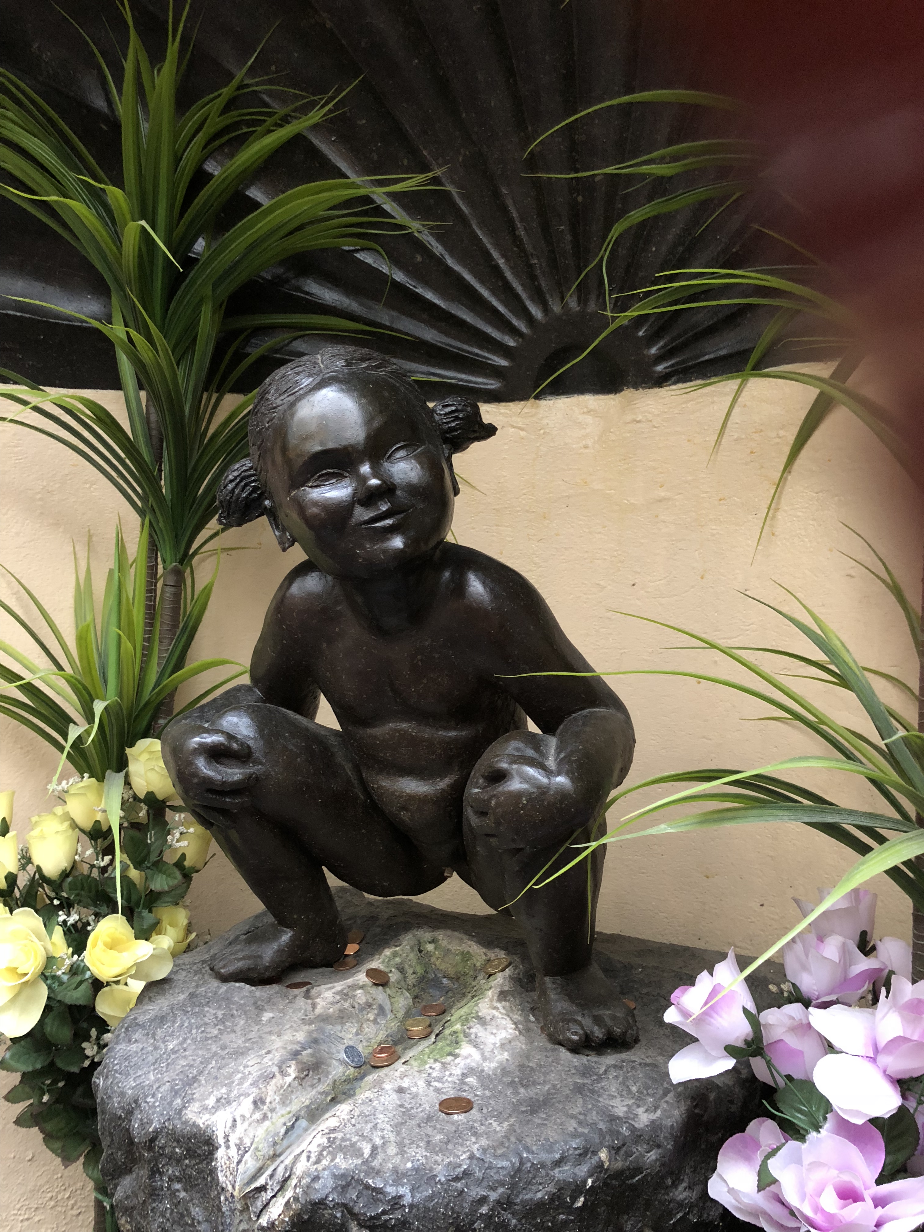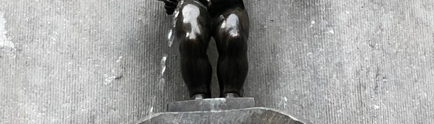 Paramos primeiro na Jeanneke Pis, uma estátua pequenininha de uma menina fazendo xixi mas que junto com o Manneken Pis são símbolo da cidade. Na verdade antes eu não sabia que tinha a menina, só conhecia o menino.