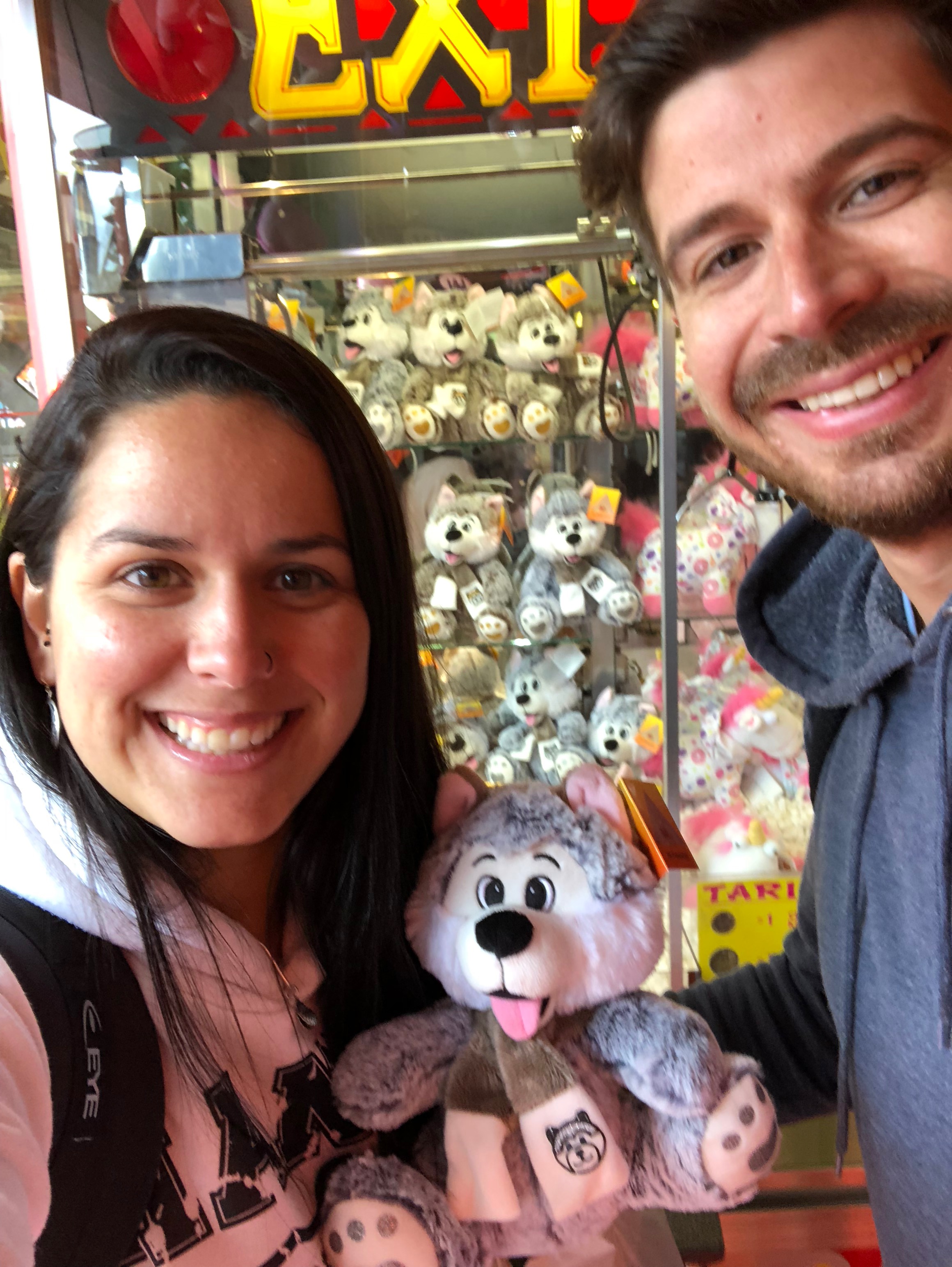 Comemos um hamburger meio ruinzinho lá (€16 casal) e ficamos curtindo a feira. Fomos na roda gigante, deu para ver boa parte da cidade lá de cima e o Vini ganhou um cachorrinho husky para mim naquela máquina de bichinhos. Eu parecia criança, me divertindo, super feliz.