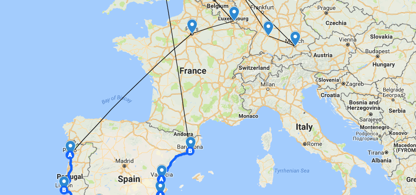 Londres (Inglaterra) – Amsterdam (Holanda) – Düsseldorf (Alemanha) – Colônia (Alemanha) – Monschau (Alemanha) – Liege (Bélgica) – Antuérpia (Bélgica) – Gent (Bélgica) – Bruxelas (Bélgica) – Luxemburgo (Luxemburgo) – Paris (França) – Porto (Portugal) – Lisboa (Portugal) – Porto Covo (Portugal) – Portimão (Portugal) – Sevilha (Espanha) – Granada (Espanha) – Almeria (Espanha) – Mojacar (Espanha) – Alicante (Espanha) – Valencia (Espanha) e Barcelona (Espanha)