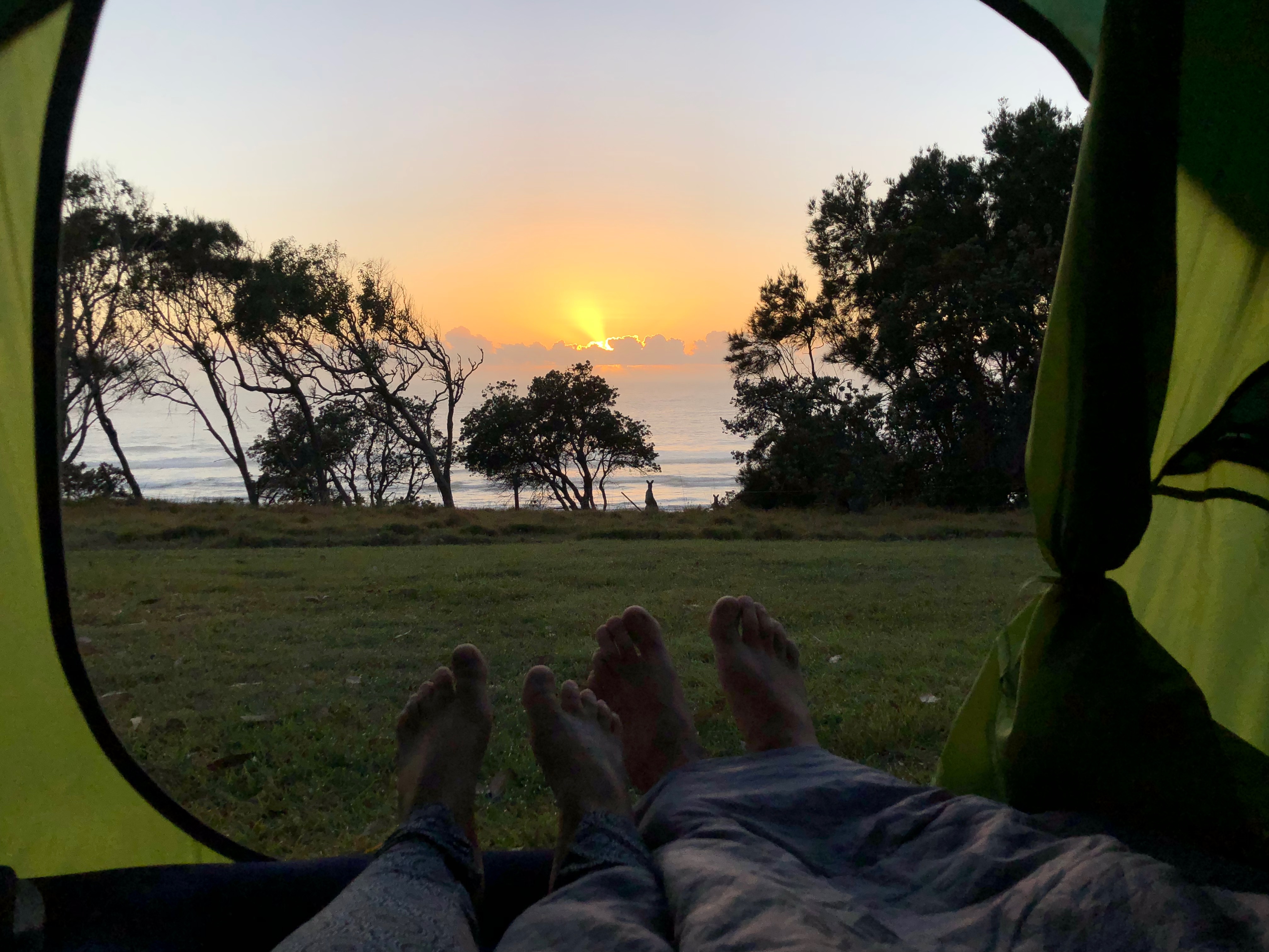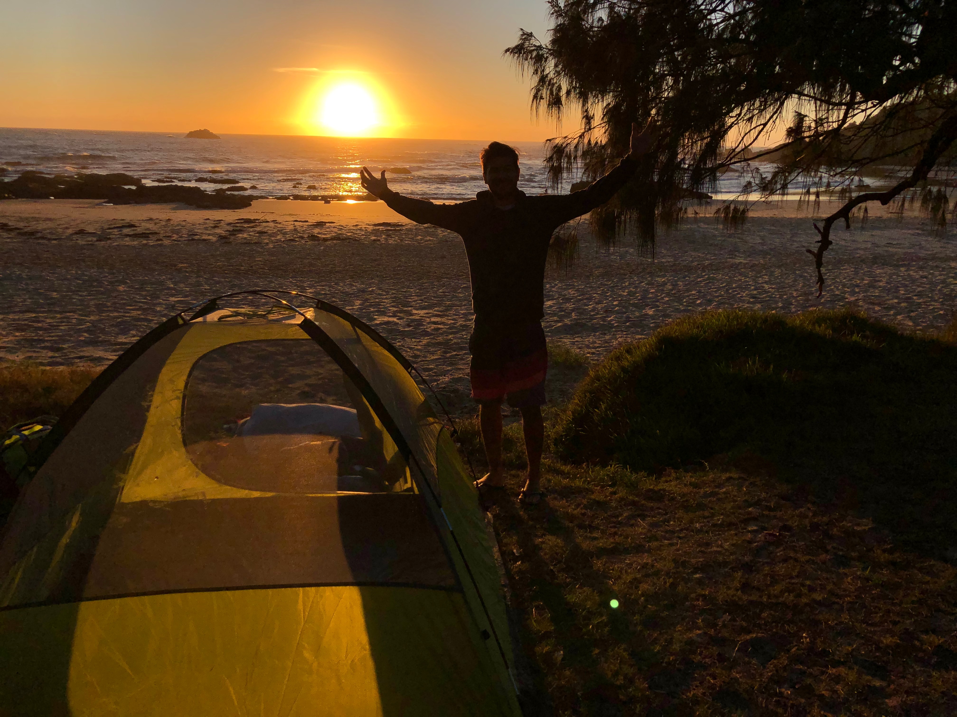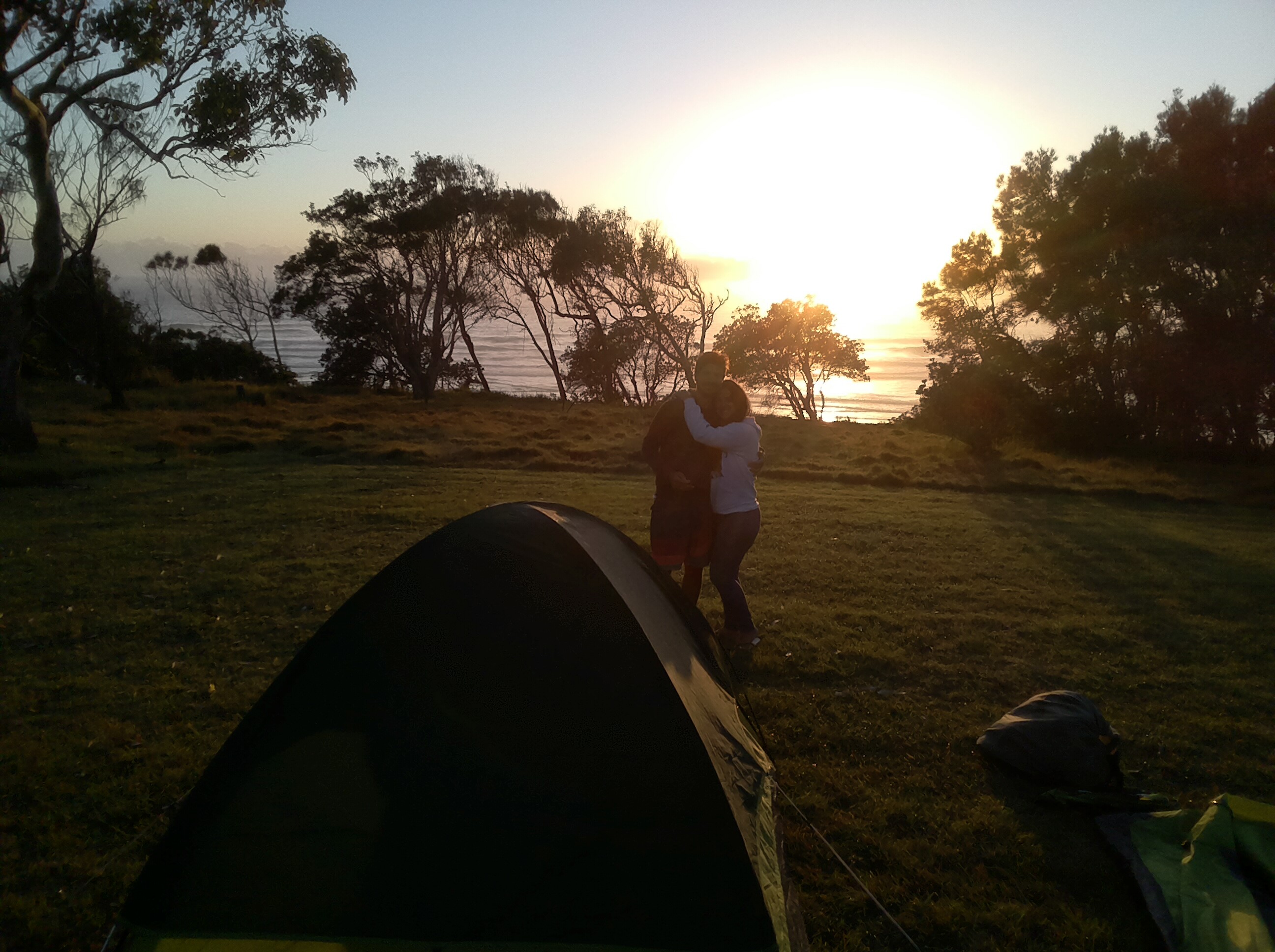Saímos de Sydney bem cedinho e a primeira parada depois de cerca de 4hs de viagem foi em Port Macquarie aonde decidimos dormir. Estava ventando muito e ficamos procurando uma praia que desse para acampar. Achamos a Oxley Beach e foi lá que ficamos. Curtimos o fim de tarde, fizemos um hambúrguer na chapa que tinha na própria praia, esperamos escurecer e armamos nossas barracas.