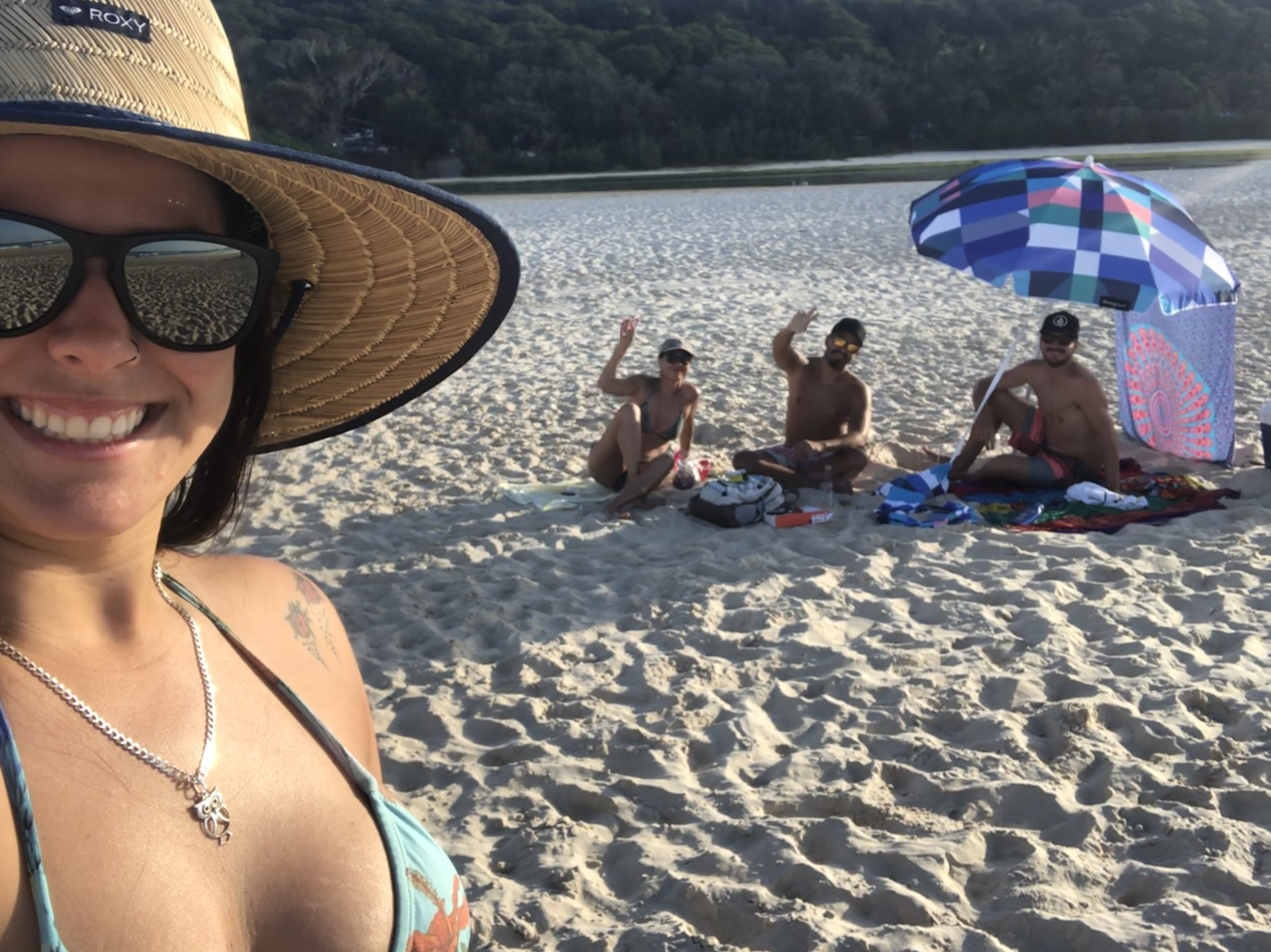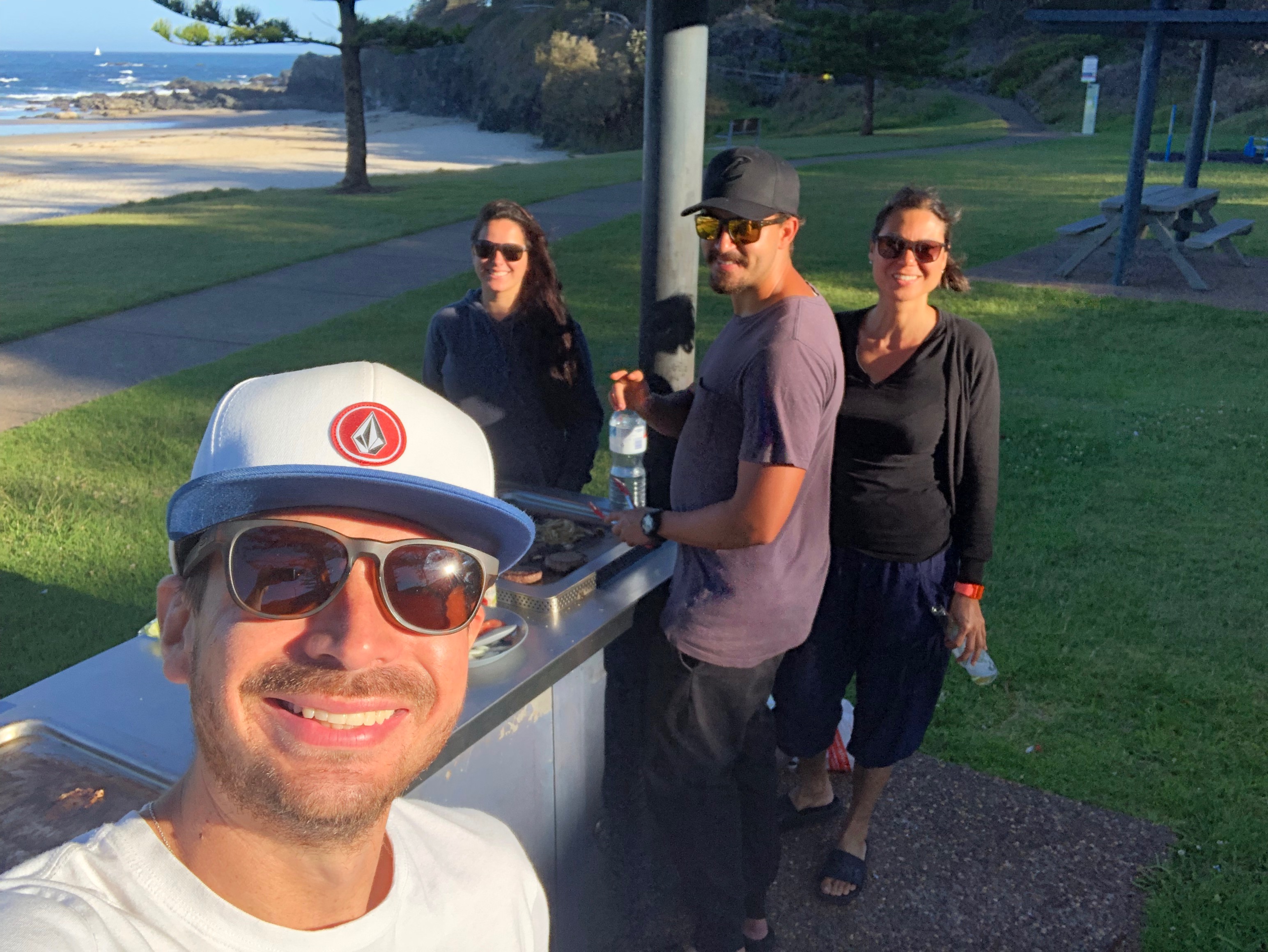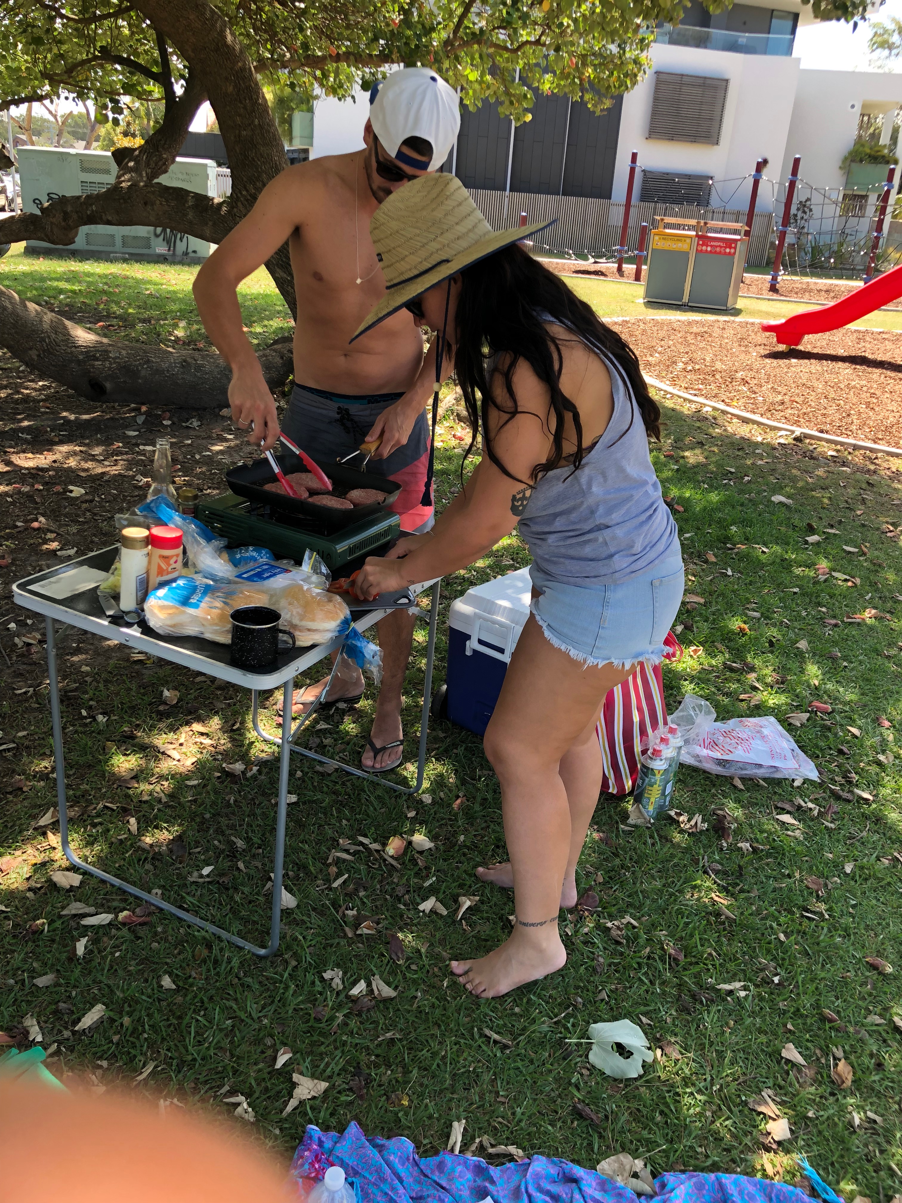 Achamos uma sombrinha, montamos as coisas e fizemos hambúrguer de almoço para nós antes de seguirmos para a Main Beach para encontrarmos a Mel e sua família.