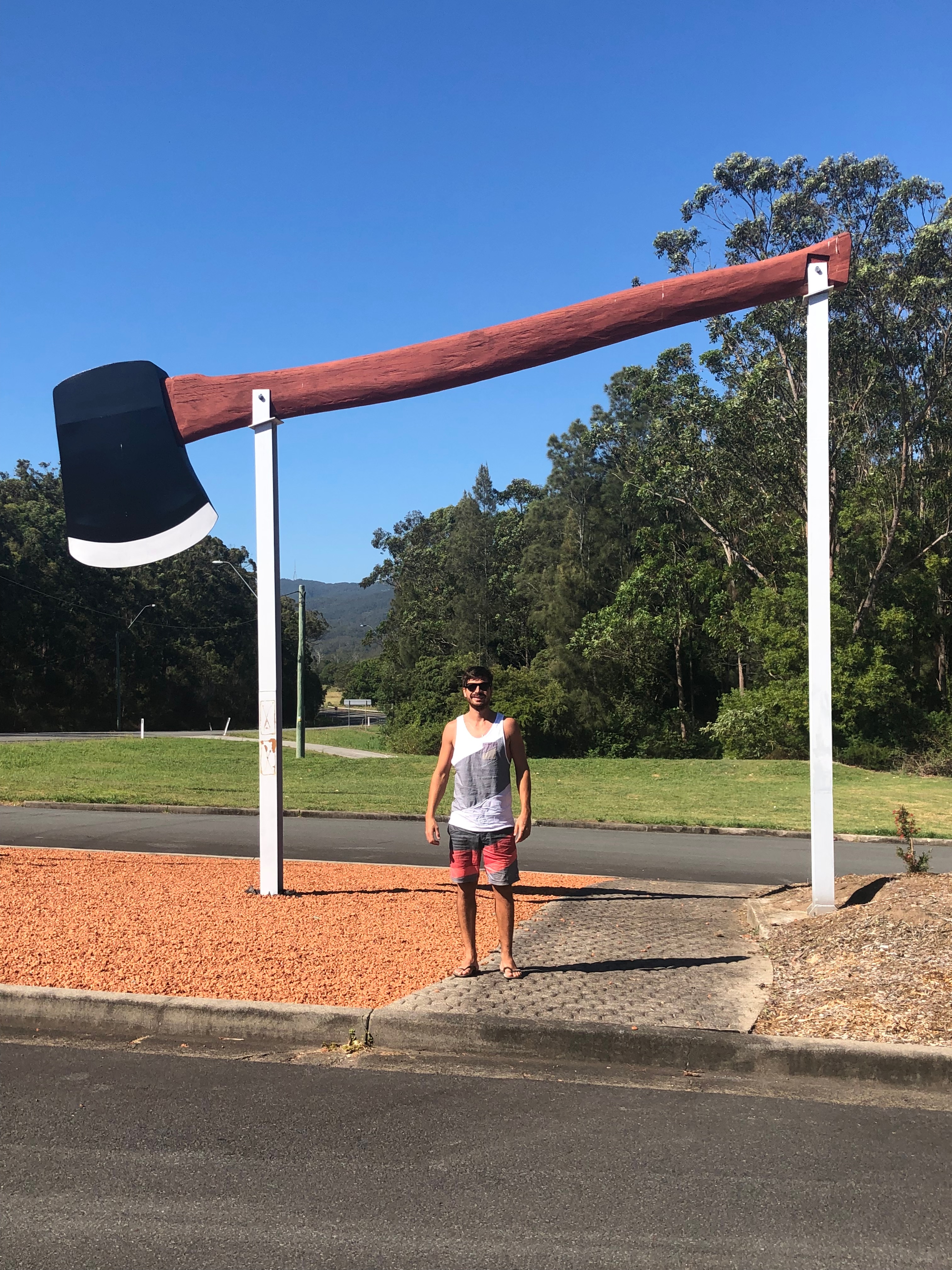 E no caminho teve também o Big Axe na cidade de Kew (perto de Port Macquarie) aonde abastecemos. Seguimos então viagem até Port Stephens e pegamos uma prainha na One Mile Beach – que ventania!