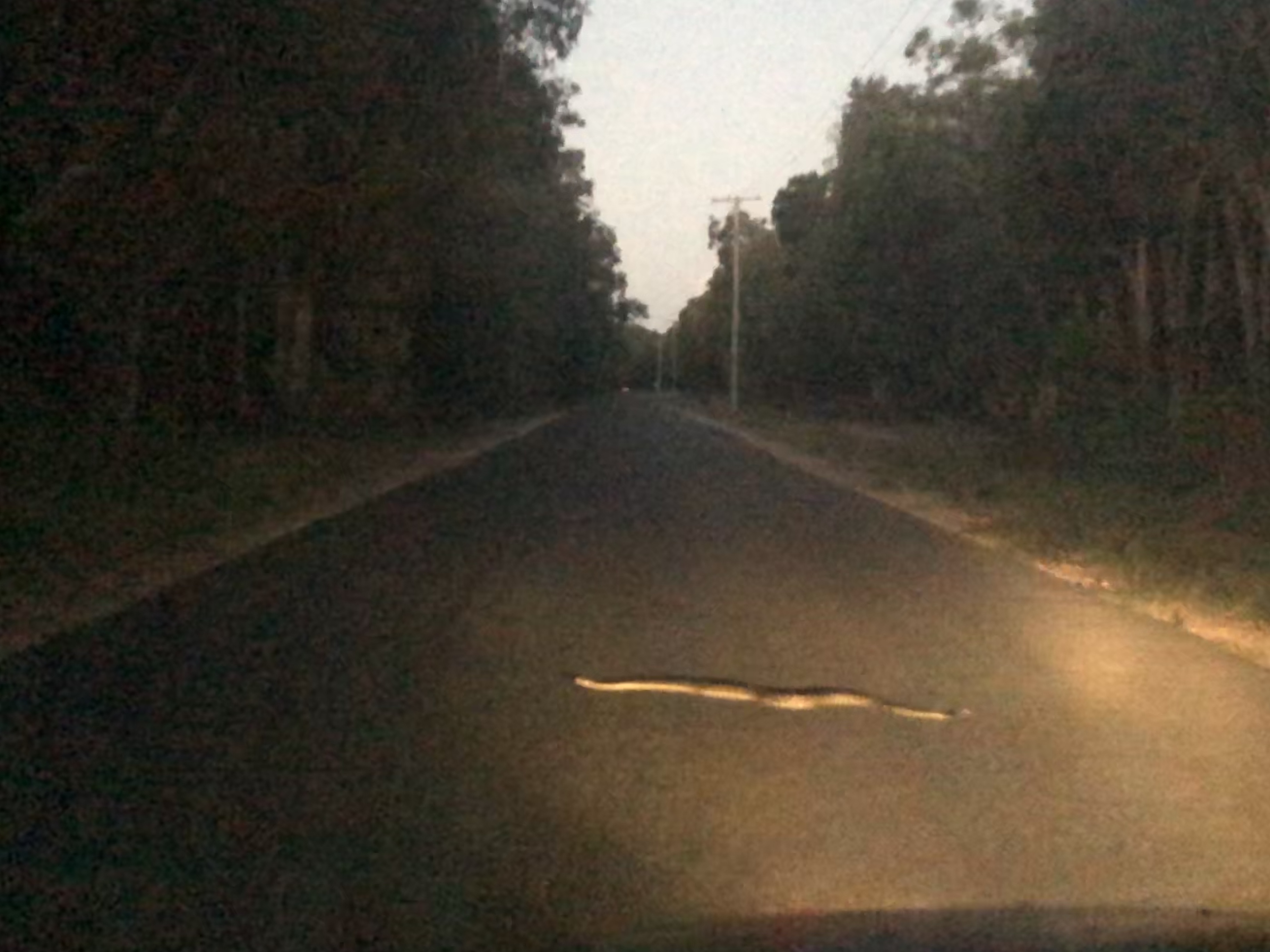 Fomos então tentar achar coala que também é bem comum nessa ilha mas não demos sorte, ao invés achamos essa cobra imensa cruzando a rua. Medo!