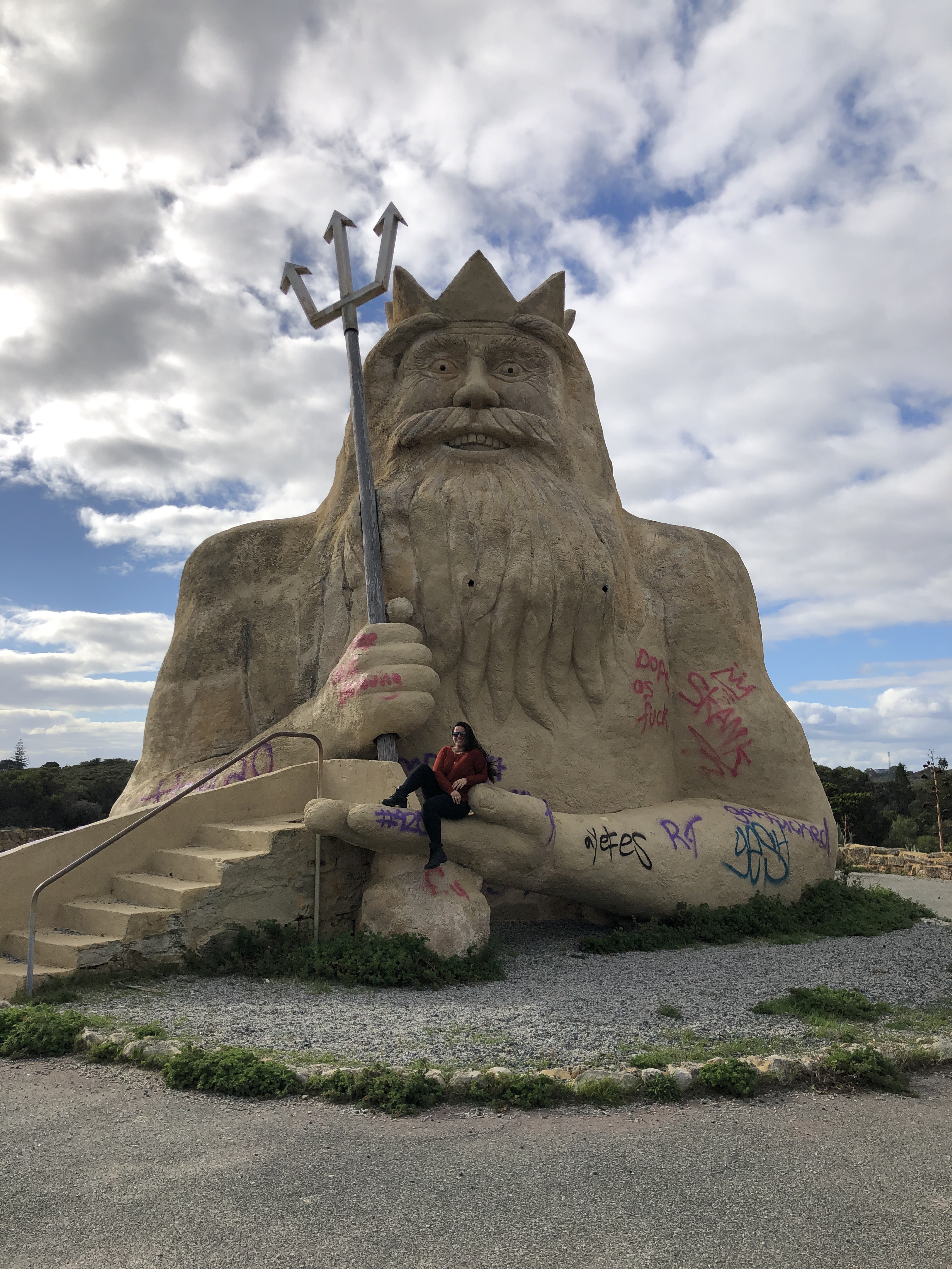 Saímos de lá e fomos até Two Rocks que fica 15 minutos norte de Yanchep para ver a estátua do Rei Netuno. Infelizmente a conservação da estátua não estava muito boa pois estava tudo pichado. Descobri que esse lugar era um parque marinho – Atlantis Marine Park e foi aberto nos anos 80 mas faliu menos de dez anos depois. Desde então o parque e as esculturas do local estão abandonadas porém mesmo assim continua sendo ponto turístico da cidade. A vista lá de cima para a praia é linda também.
