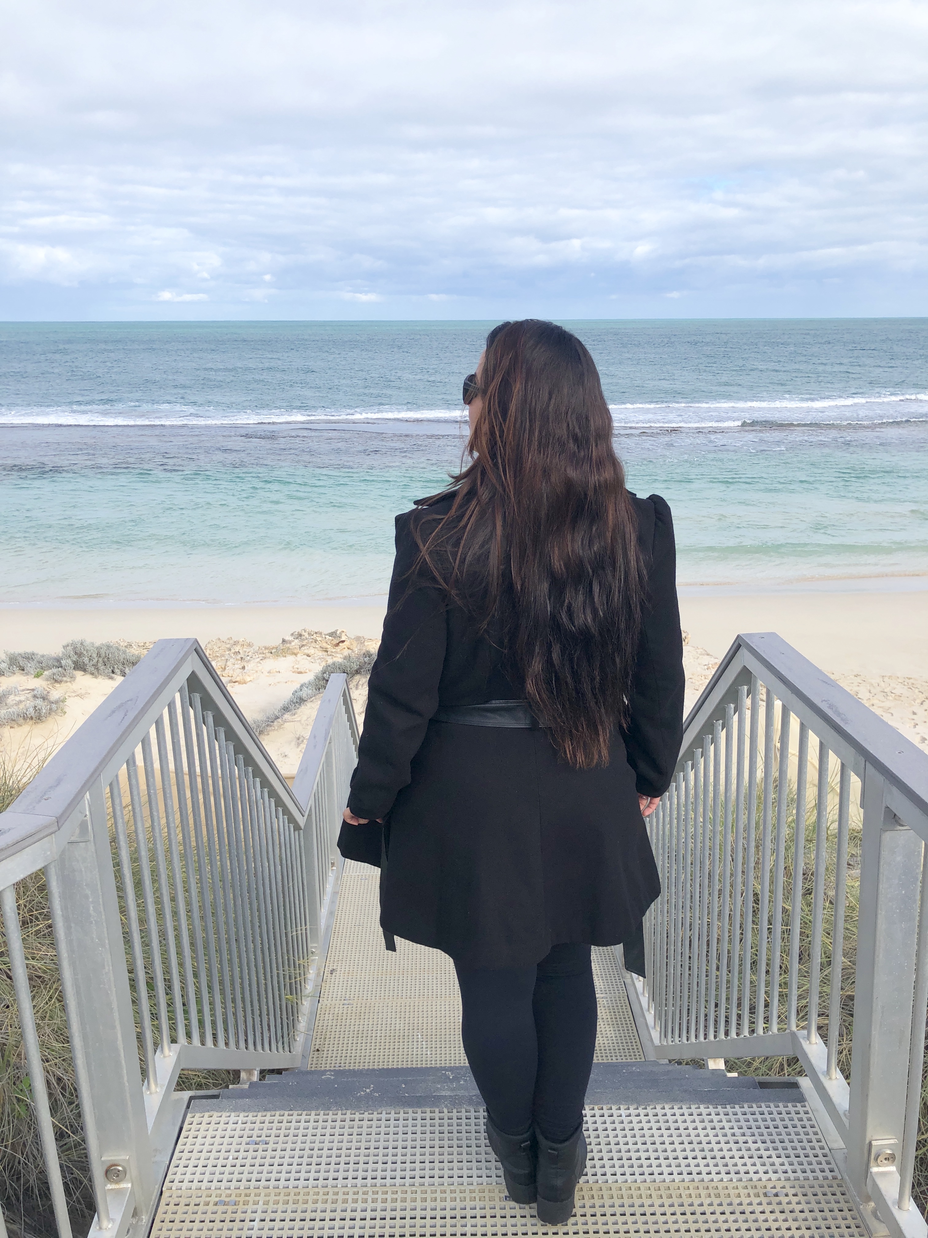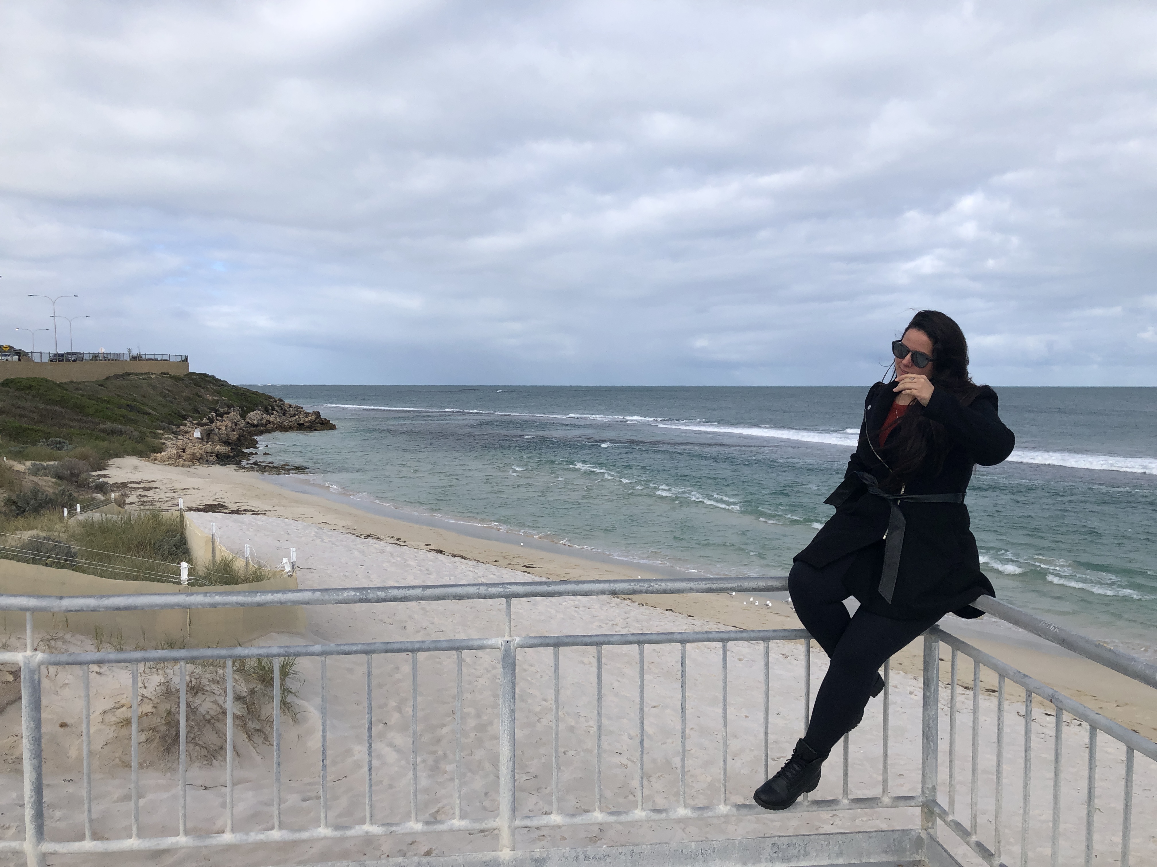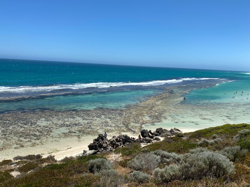 Fomos primeiro até a Yanchep Lagoon, uma praia extensa super linda. Eu simplesmente amo esses tons de azul que o mar na Austrália tem – surreal. Aproveitamos para descer uma escadinha até a praia.