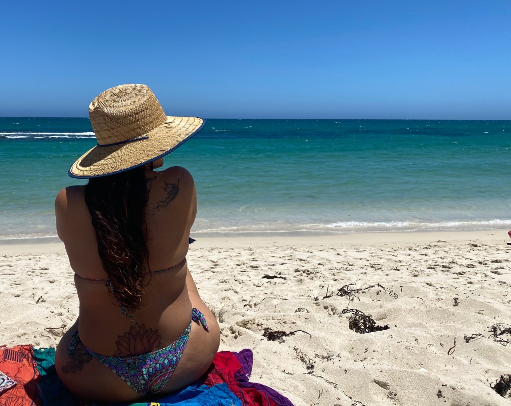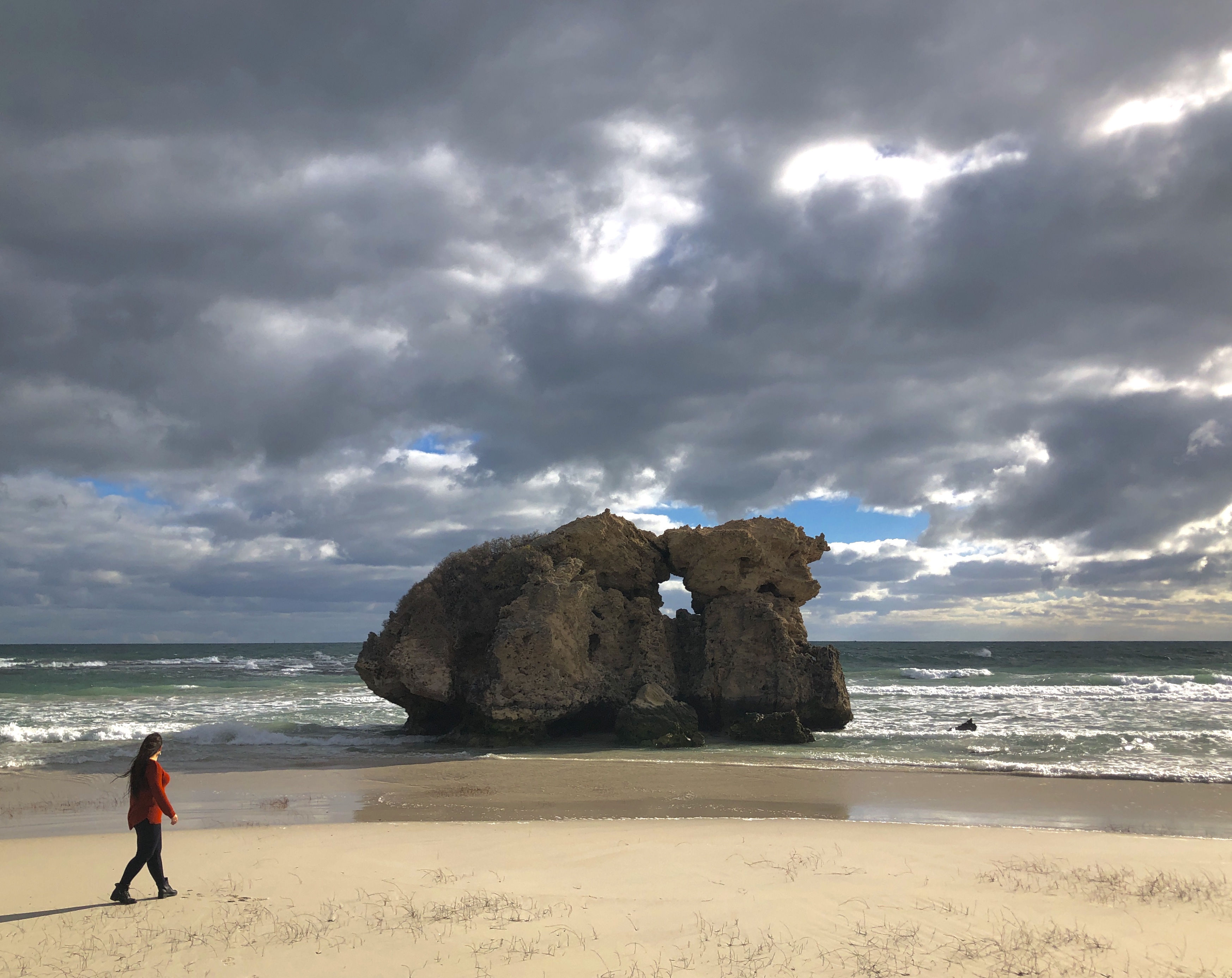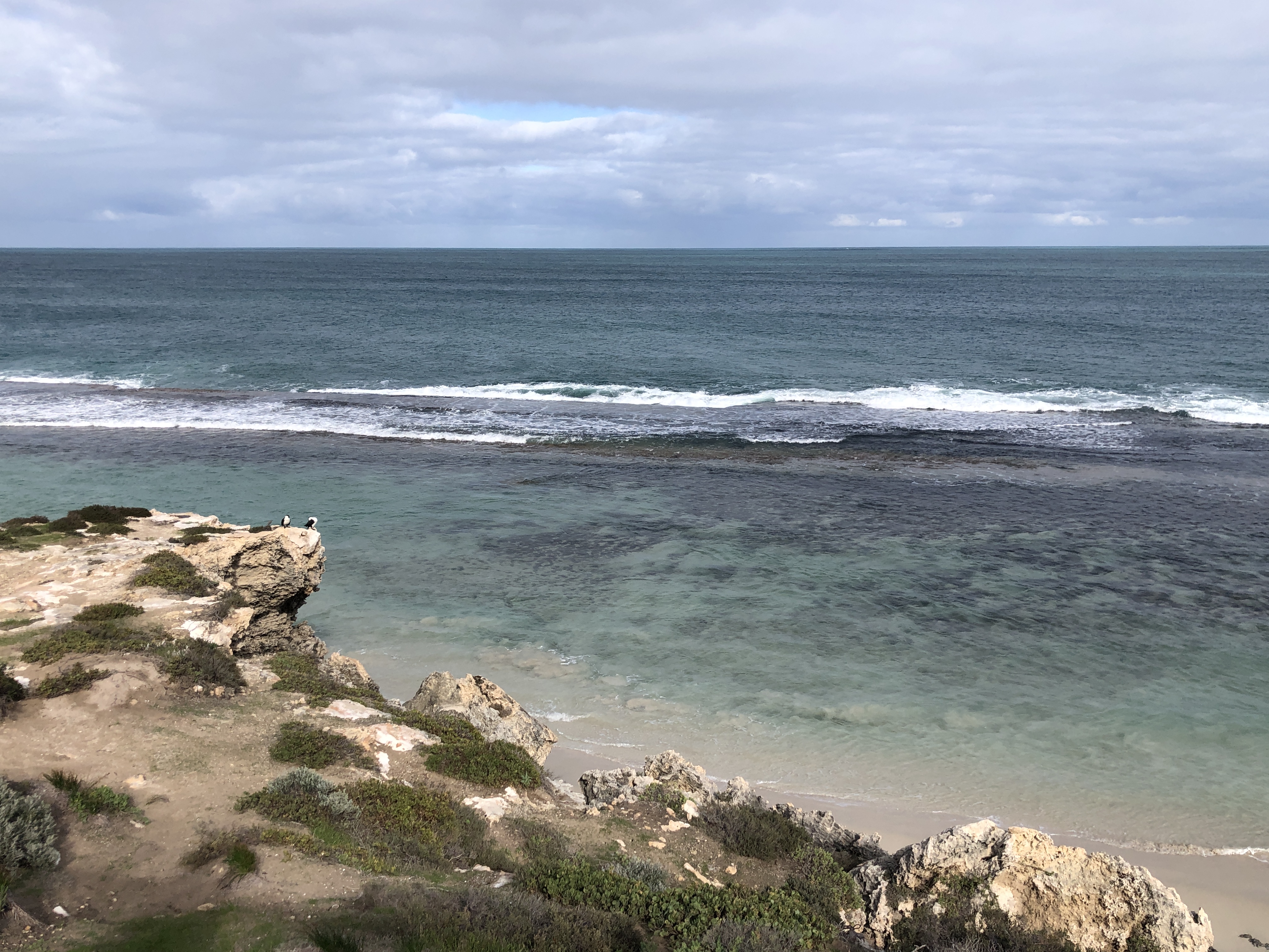 Fomos primeiro até a Yanchep Lagoon, uma praia extensa super linda. Eu simplesmente amo esses tons de azul que o mar na Austrália tem – surreal. Aproveitamos para descer uma escadinha até a praia.