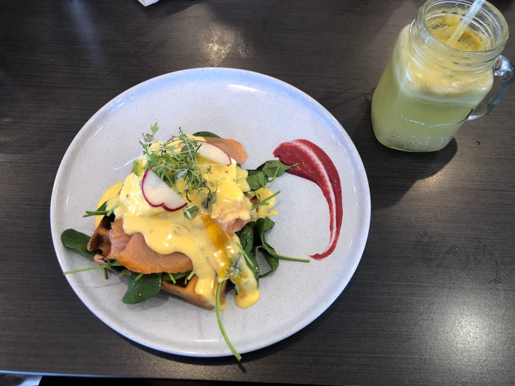 Agora se está procurando um lugar para tomar café da manhã, achei muito bom e fresco o Cafe 2Twenty Four em Belmont. O Eggs Benedict é muito bom e tem suco de frutas natural – coisa rara de achar aqui na Austrália.