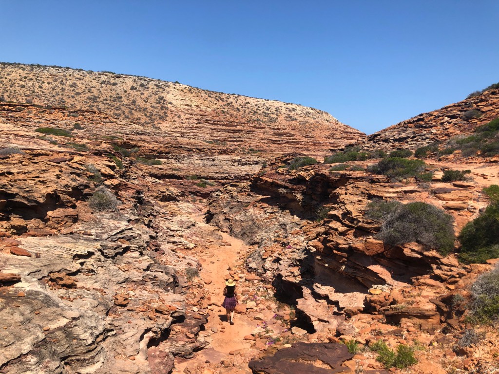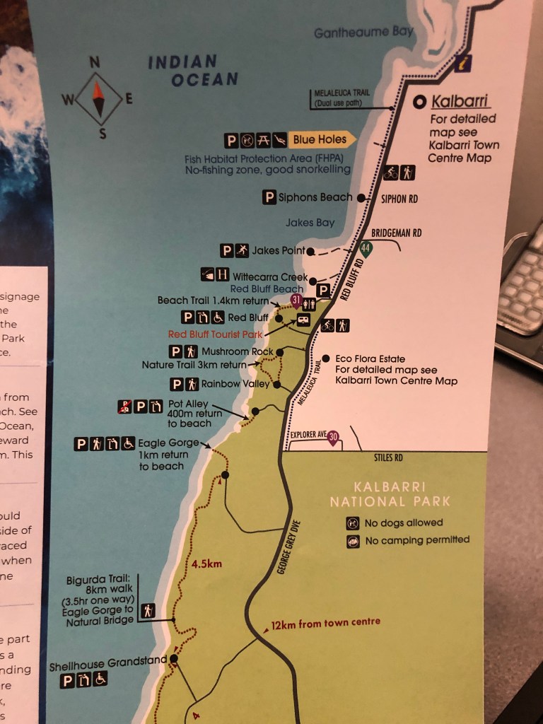 Mais 40 minutos e chegamos em Kalbarri, uma cidade incrível cheia de coisas para ver e fazer. Começamos pela Island Rock e depois paramos no Grandstand. No caminho pela costa é possível ver diversas formações rochosas que valem super a pena pois é de tirar o fôlego. É possível fazer a caminhada a pé e conhecer bastante coisa como podem ver no mapa abaixo.