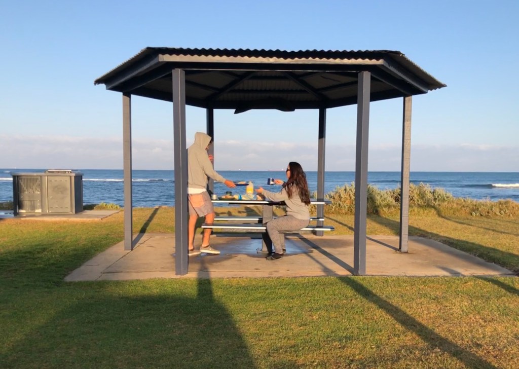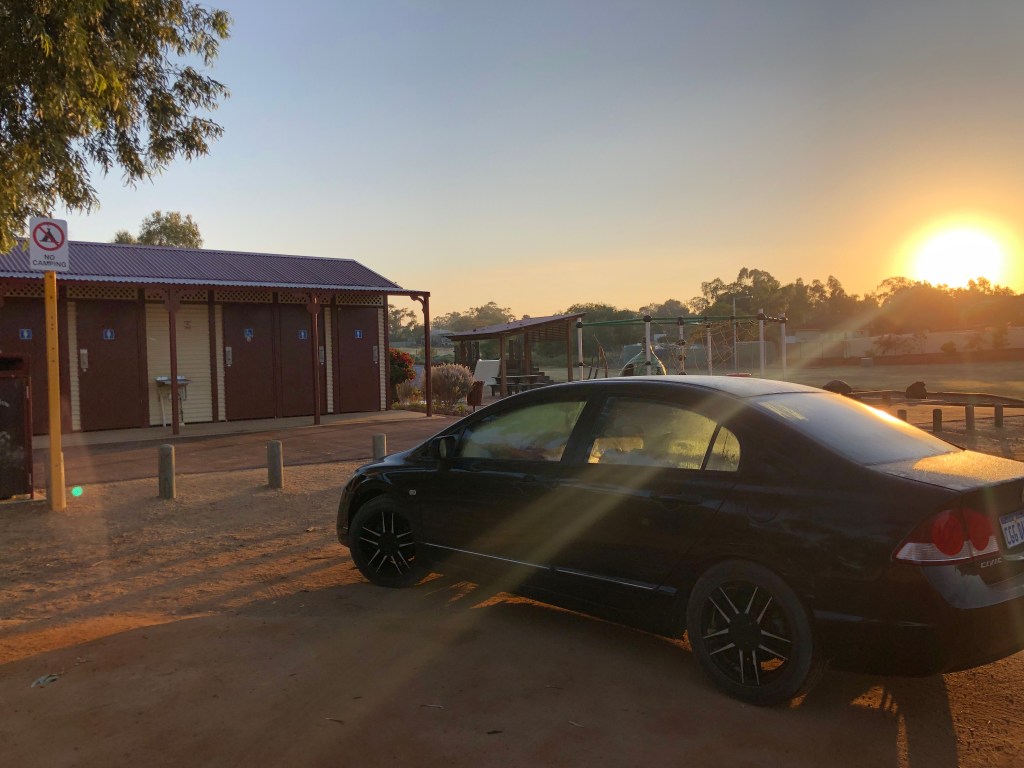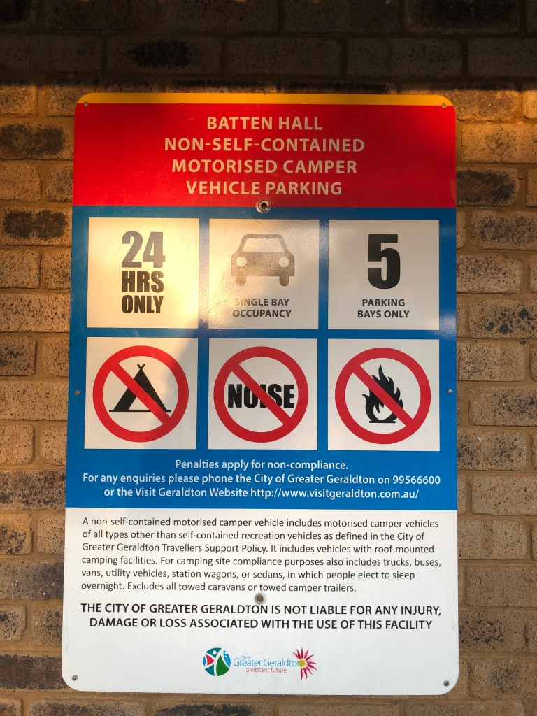 Feriado em Perth e nada melhor do que viajar para aproveitar. Fizemos compras para levar ($90) e saímos por volta das 4:30 da tarde direto para Geraldton – que é praticamente meio caminho até Shark Bay. Foram 4h30 de estrada e só paramos para abastecer ($33) e comprar gelo pro nosso cooler ($4). A viagem foi bem tranquila, mesmo sendo feriado a estrada estava vazia. Chegamos por volta das 9 da noite e ficamos rodando um bom tempo pra achar um lugar para acampar e nada. Nas praias estava muito vento e/ou tinha câmera e os campings fechados desde as 8 da noite. Pesquisei e achei dois lugares que daria para dormir no se for o que eles chamam de Non-self-contained, ou seja, carro – ou campervan se for o caso. Fomos até o Point Moore que fica em frente ao Lighthouse porém achei meio estranho o clima ali então seguimos para a segunda opção em John Batten Community Hall – bem melhor mas não podia armar a barraca então dormimos no carro mesmo! Ah, se você estiver de motorhome (self-contained) pode dormir legalmente no Francis Street Carpark.