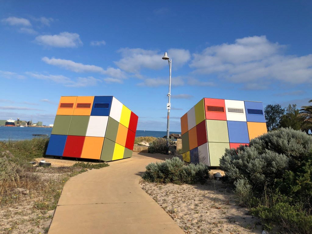 Paramos rapidinho na Town Beach para eu ir no banheiro e olha que divertido os banheiros hehe são os cubos mágicos (Rubik´s Toilet).