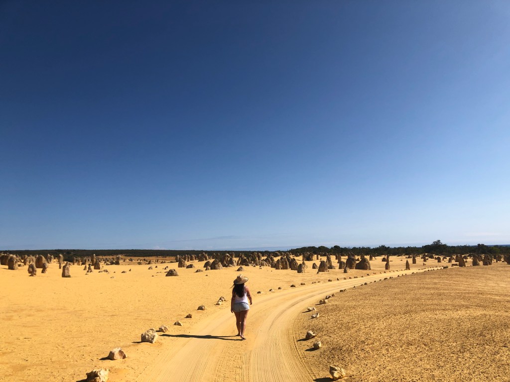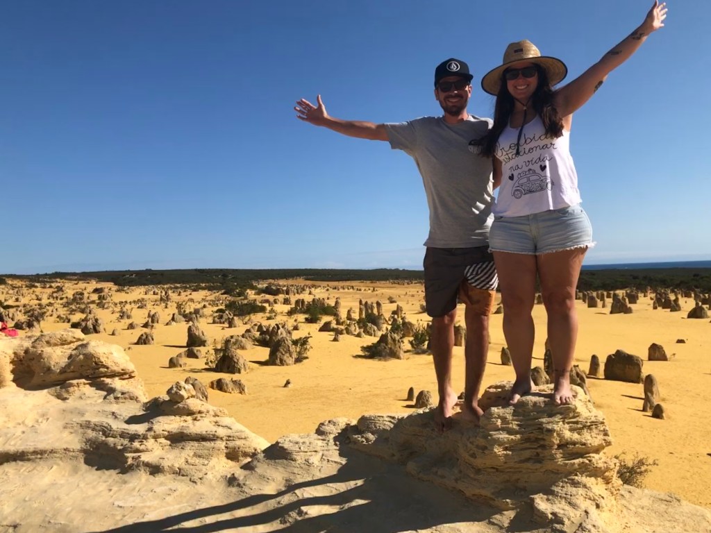 Andamos pelos Pinnacles e eu acho muito doido como pode ser uma areia tão amarela quase em frente a uma praia de areia tão branca. A vegetação e paisagem muda muito subindo sentido norte a costa de WA.