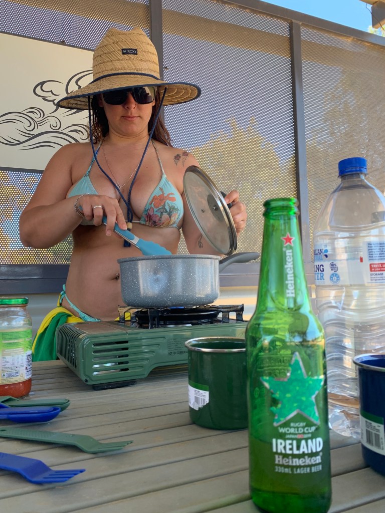 Achamos uma praia chamada Chinamans Beach super bonita que deu para passar a tarde. Nela o rio encontra o mar e dá diversos tons de cor, muito legal. Aproveitamos também para fazer nosso almoço e tomar banho – vulgo ducha gelada – já que essa praia tem todas as facilidades.