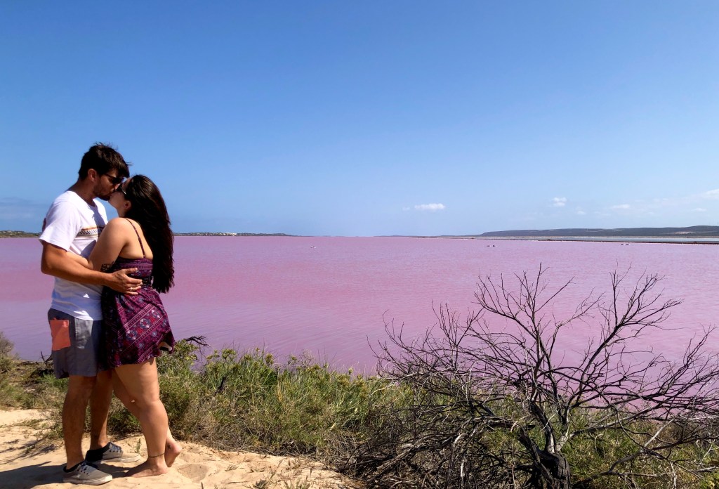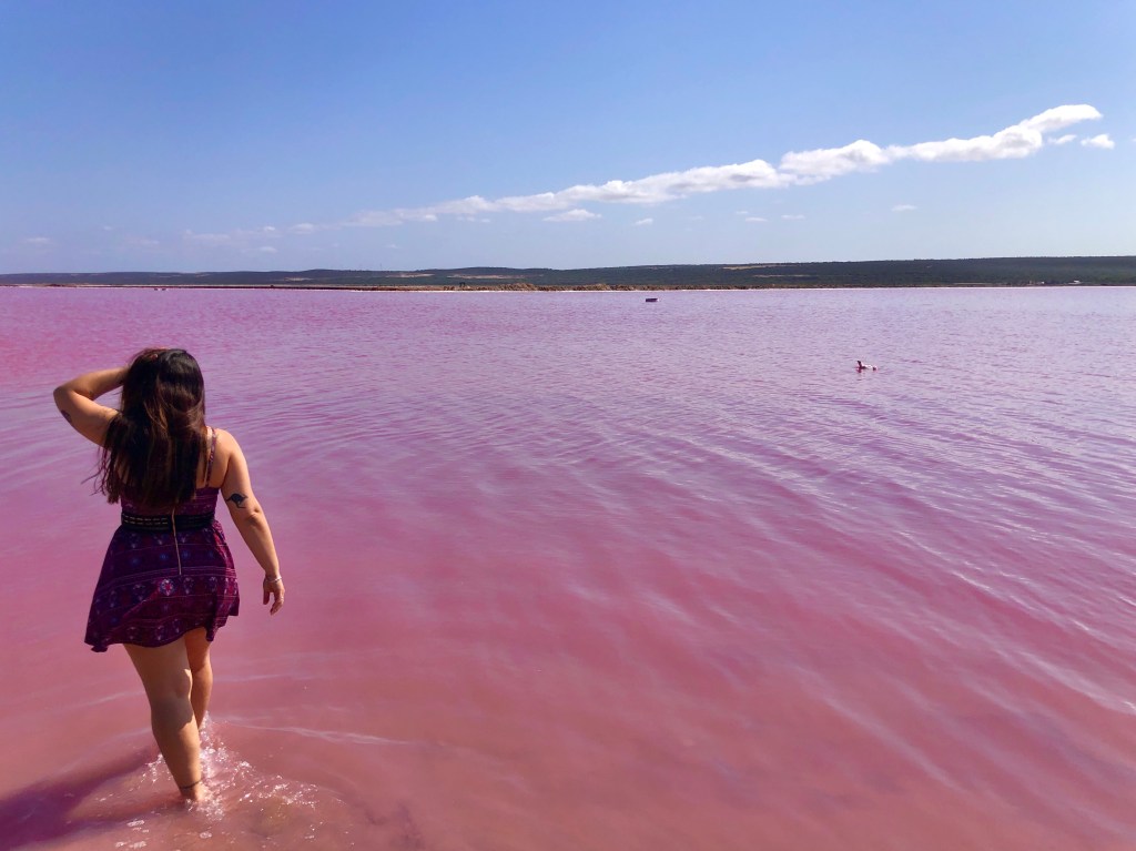Próxima parada foi o surpreendente Pink Lake. Quem me acompanha sabe que vi um em Melbourne e Adelaide também e já tive uma tentativa frustada aqui em Western Australia num lago que há anos não é mais rosa mas esse foi o mais surreal. O lago é gigantesco, rosa rosa rosaaaaa mesmo, tipo chiclete tutti frutti e ao lado tem um outro lado que é azul, então dá um contraste muito legal. Se você tem drone, as fotos ficam incríveis de cima também.