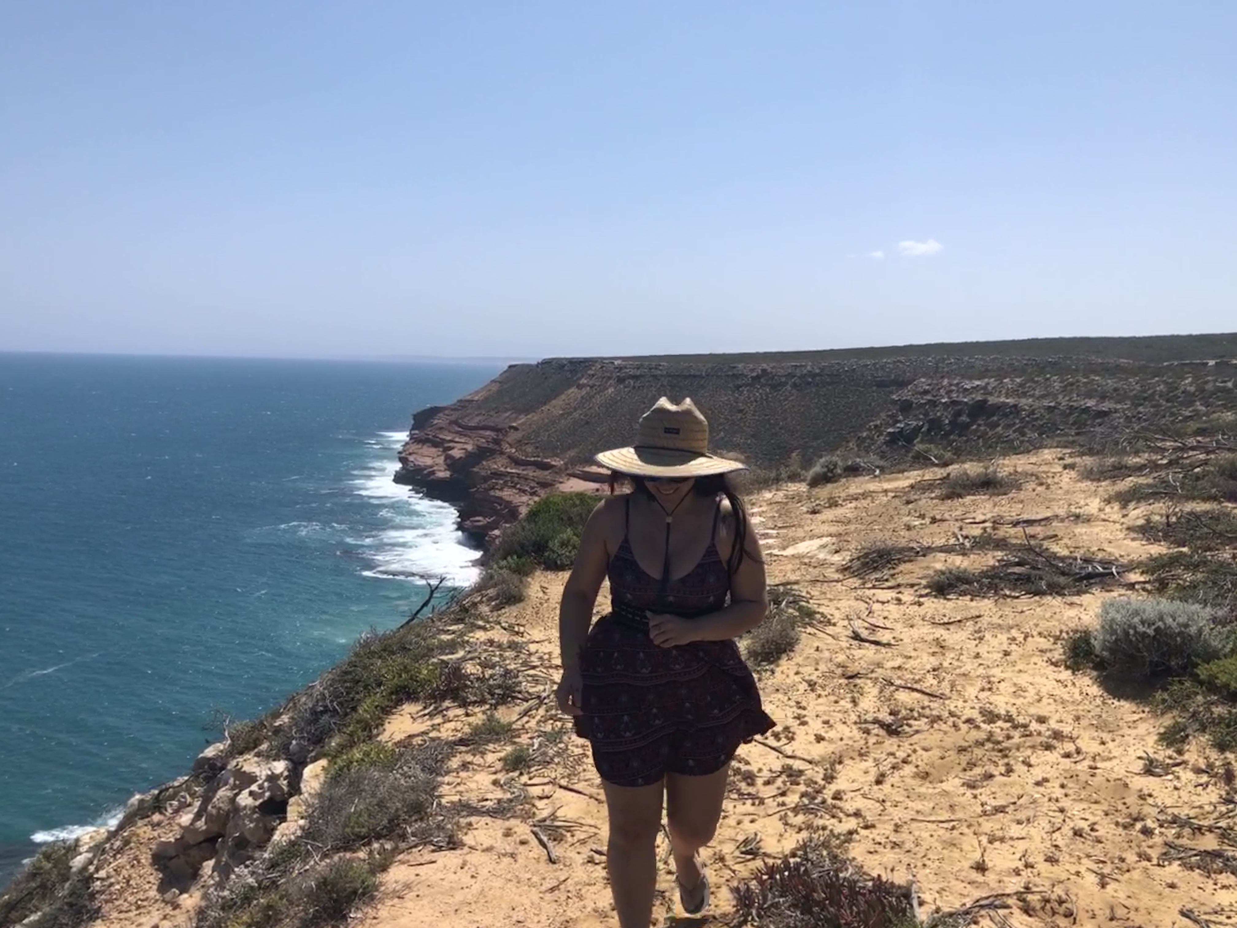 Paramos na Dynamite Bay em Green Head, super bonita. Tem uma trilha que dá para fazer e ver três baías, parece bem interessante. Andamos até uma grutinha que tinha na água. Essa praia tem toda a estrutura também- chuveiros, churrasqueira, banheiros.